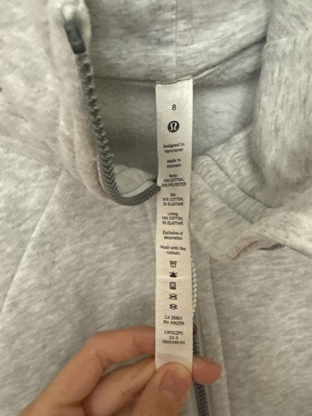 This Lululemon zip-up hoodie is a light grey colour and a cropped fit. It's made from a blend of cotton and polyester. It's designed in Vancouver and made in Vietnam. This hoodie is a size 8.