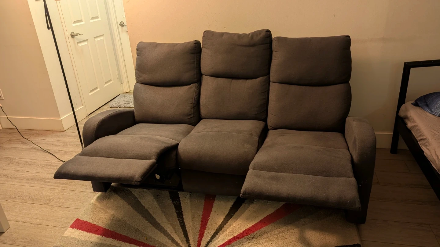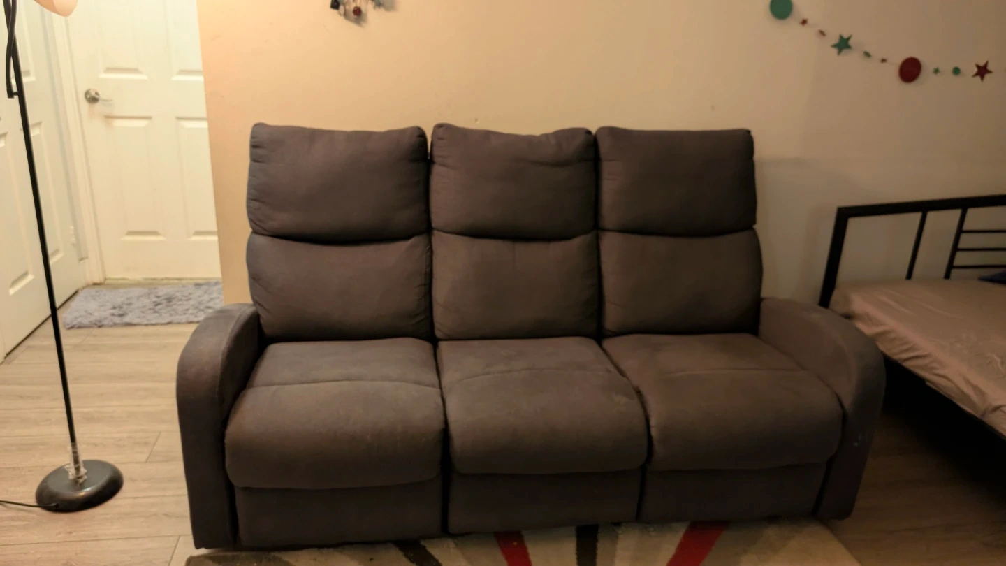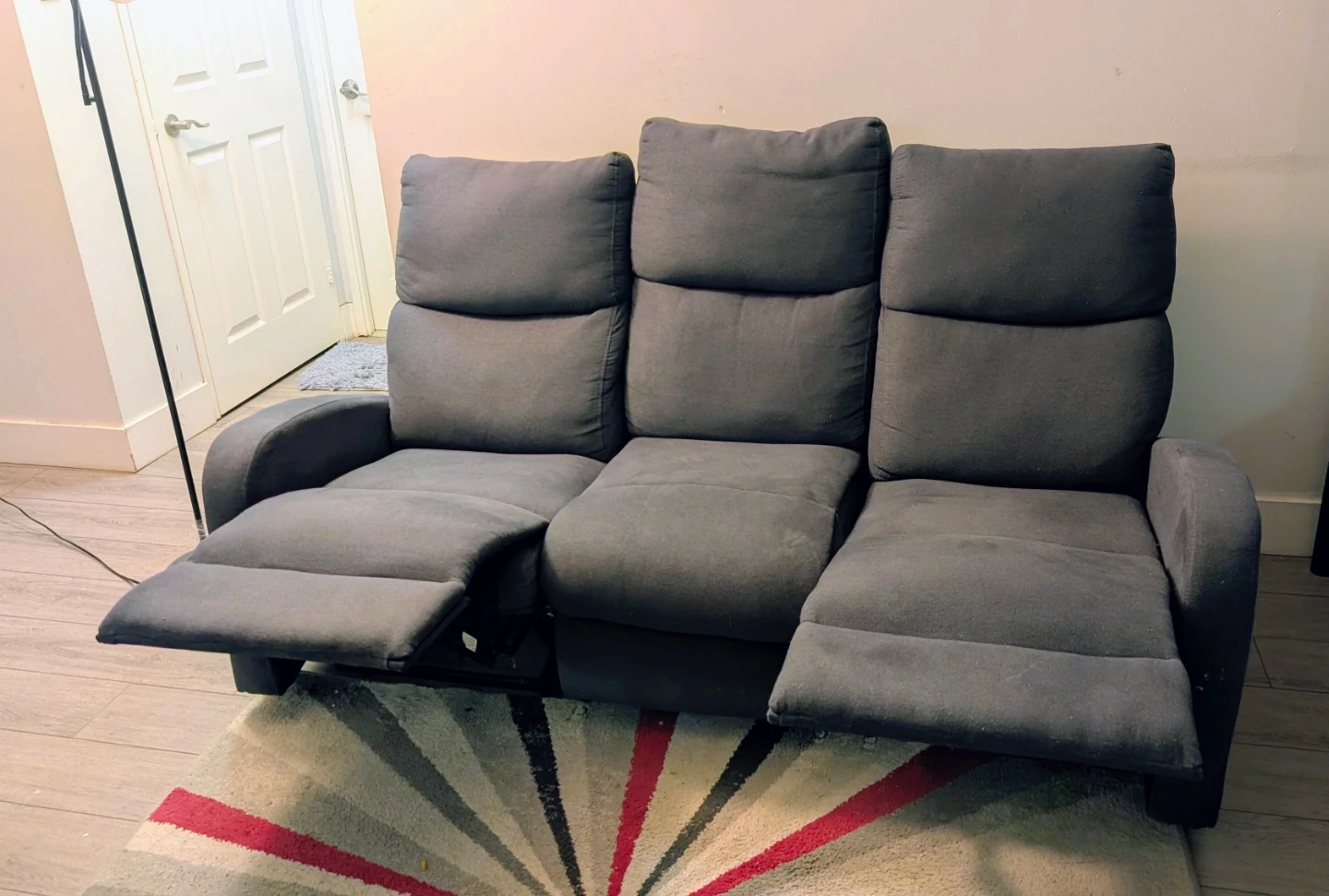 Dark grey three-seater reclining sofa. Upholstered in a soft, durable fabric. Each seat reclines independently. It's a comfortable seating option for a living room or entertainment space.