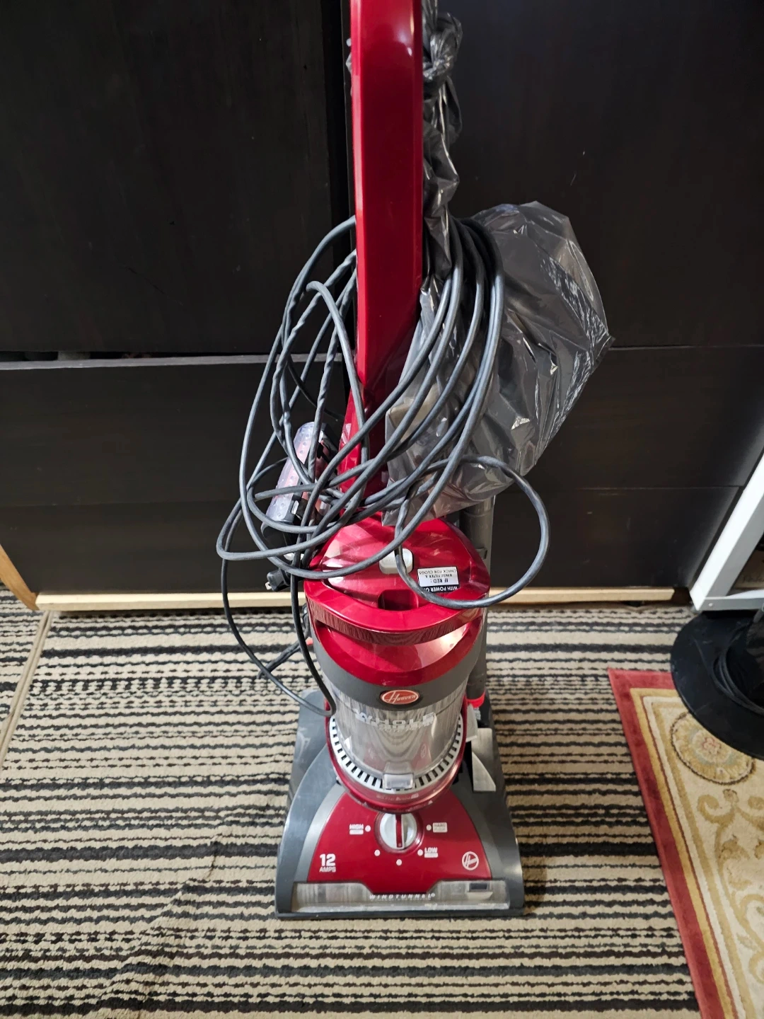This Hoover vacuum is designed for whole house cleaning and pet hair removal. It features WindTunnel Technology and a 12 AMP motor for powerful suction. Condition is used and it does squeak an fair bit but is fully functional otherwise and includes all components including manual.
