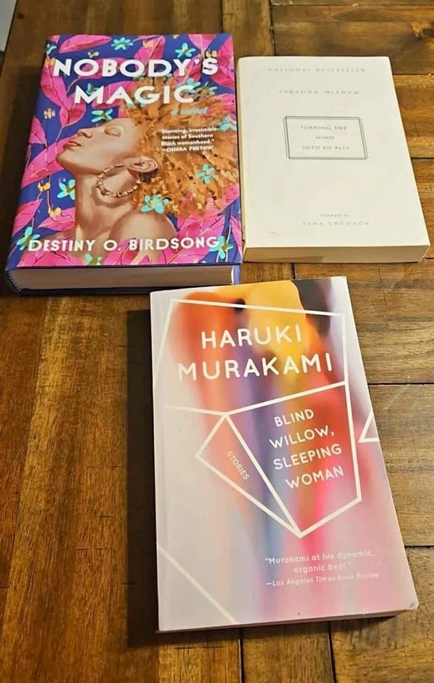 Awesome book bundle! Got these three great reads. Haruki Murakami's 'Blind Willow, Sleeping Woman' stories, Destiny O. Birdsong's 'Nobody's Magic', and Sakyong Mipham's 'Turning the Mind Into an Ally'. All ready for a new reader.