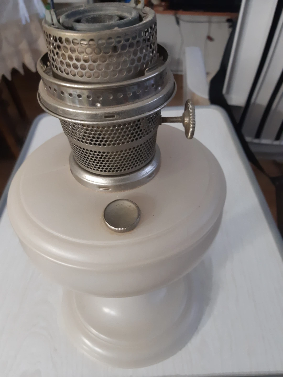 This is a vintage kerosene lamp with a beige glass base and a metal burner assembly. It has a ribbed texture on the metal parts and a functional adjustment knob. The base is smooth and bulbous, providing a stable foundation. It's a classic piece for ambient lighting or decor.