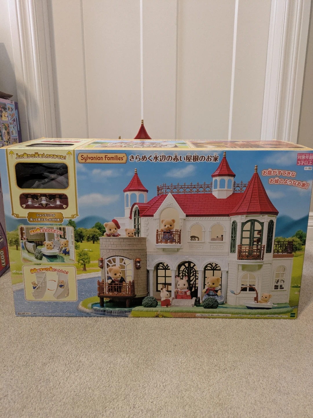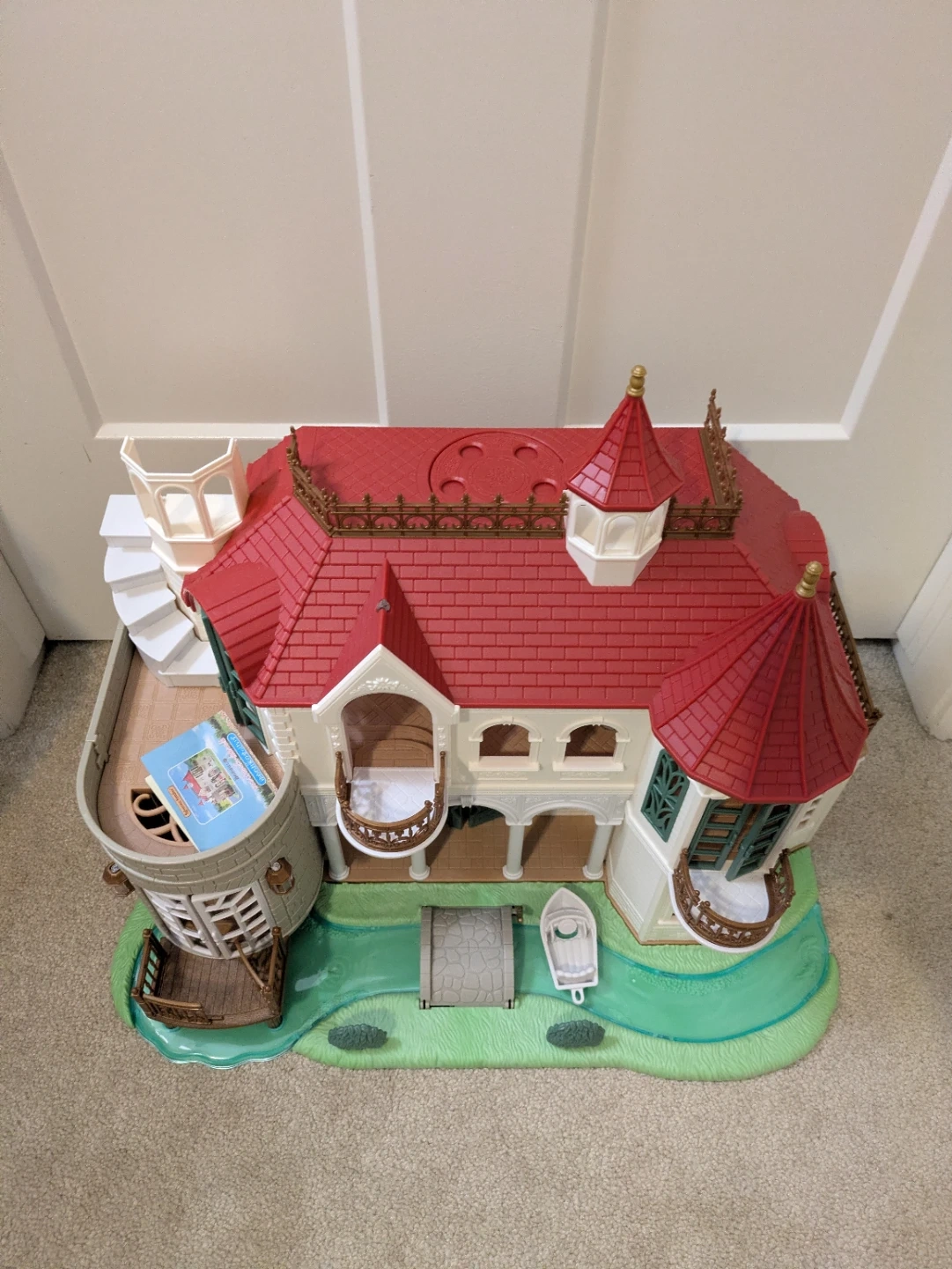 It's a calico critters house. Features multiple floors, balconies, and a charming red roof design. Includes a small boat and bridge accessory.