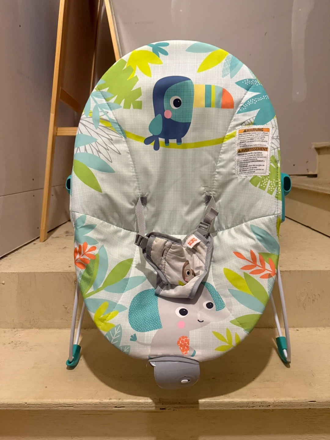 This Bright Starts baby bouncer seat features a jungle-themed print with toucans and elephants. It has a secure harness for safety. It's perfect for keeping your little one entertained and comfortable.