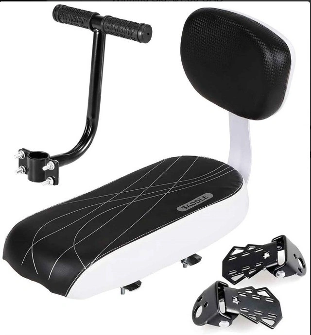 Comfortable and safe padded seat and backrest for a comfortable ride. Armrest handrail and footrests add security for children. Fits children over 5 years old, also suitable for adults. Made with high-quality PU leather, sponge, and steel. Easy to install on most bike rear racks, including hybrid, mountain, and electric bikes.