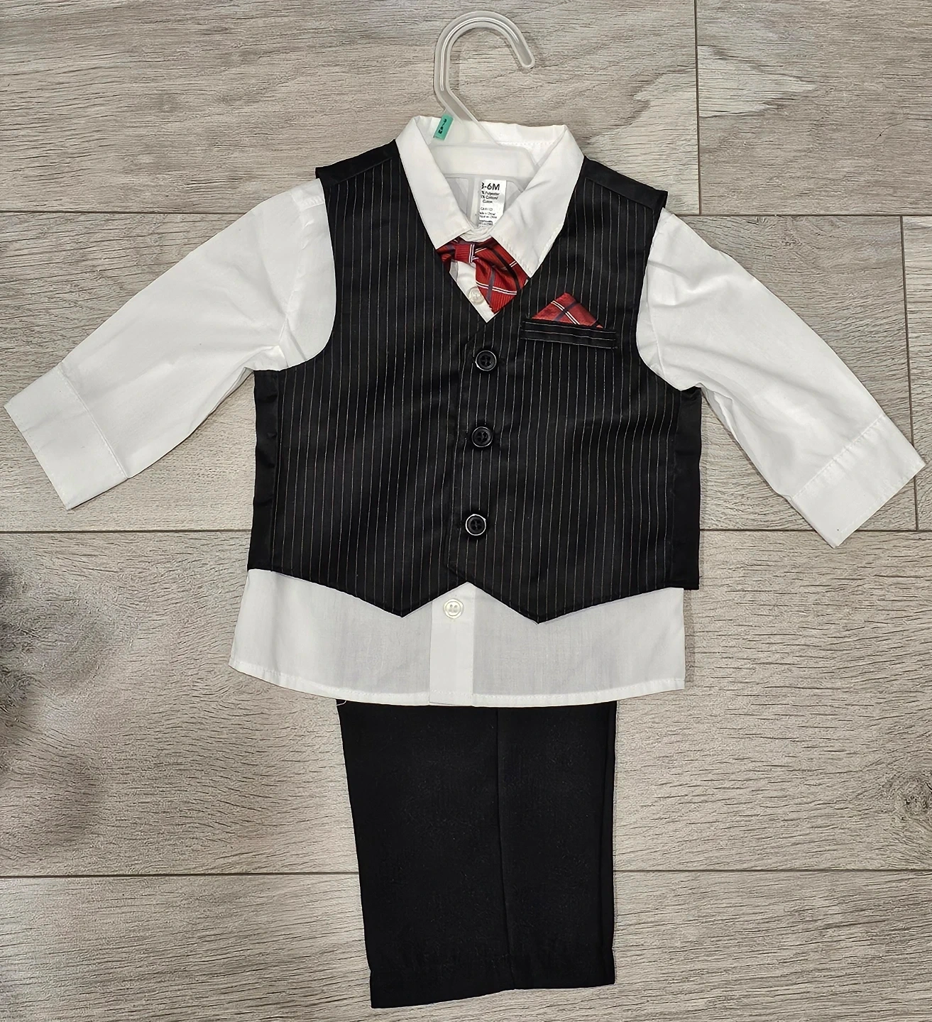 Little gentleman's formal wear set! It's a three-piece outfit including a white button-up shirt, a pinstripe vest, and black pants. The vest has a cute red and white patterned pocket square accent. It's perfect for special occasions!