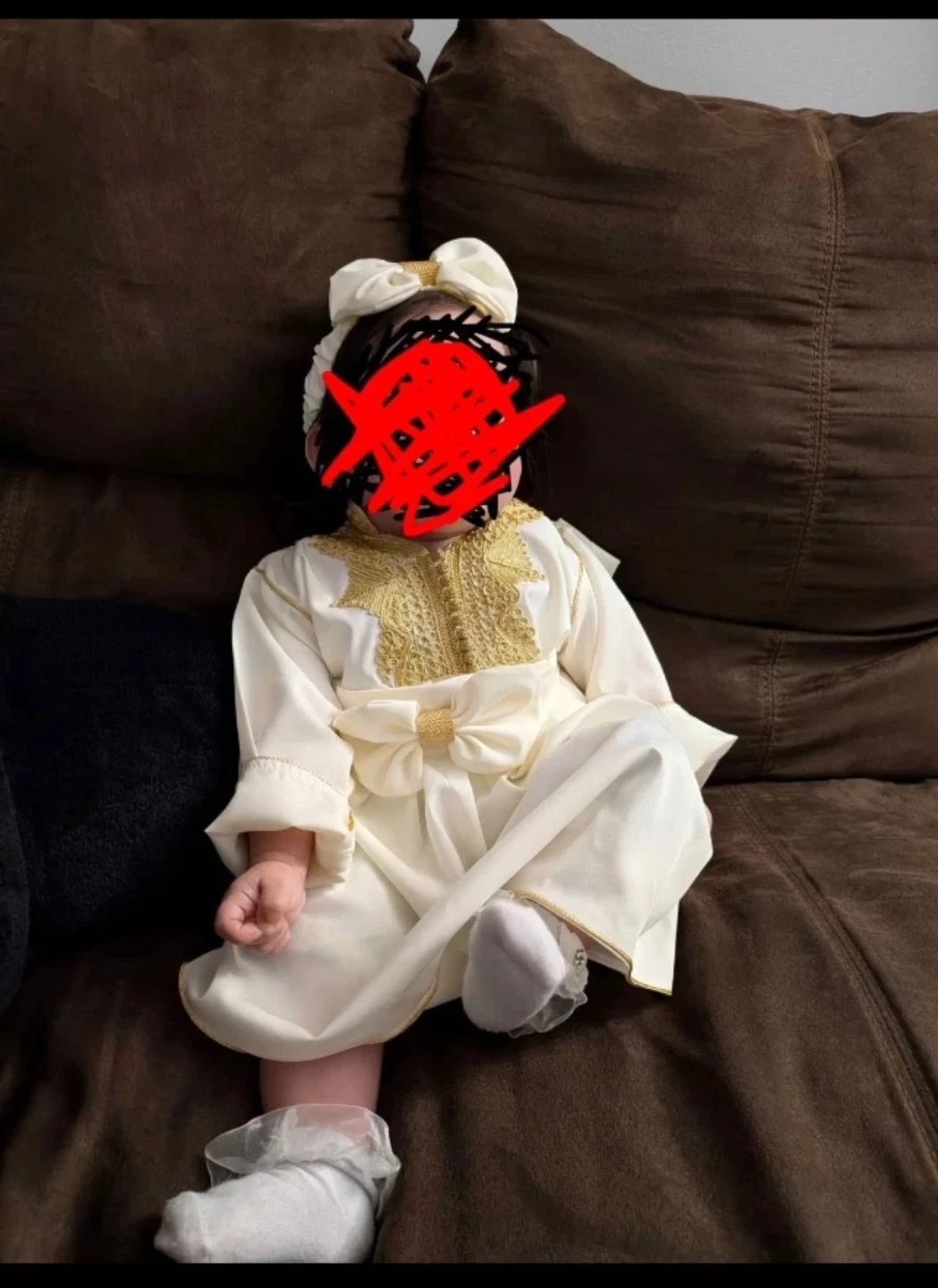 Beautiful white and gold moroccan dress for a baby girl. It features intricate gold embroidery on the bodice and a large bow accent at the waist. Includes a matching headband with a bow. Perfect for special occasions!