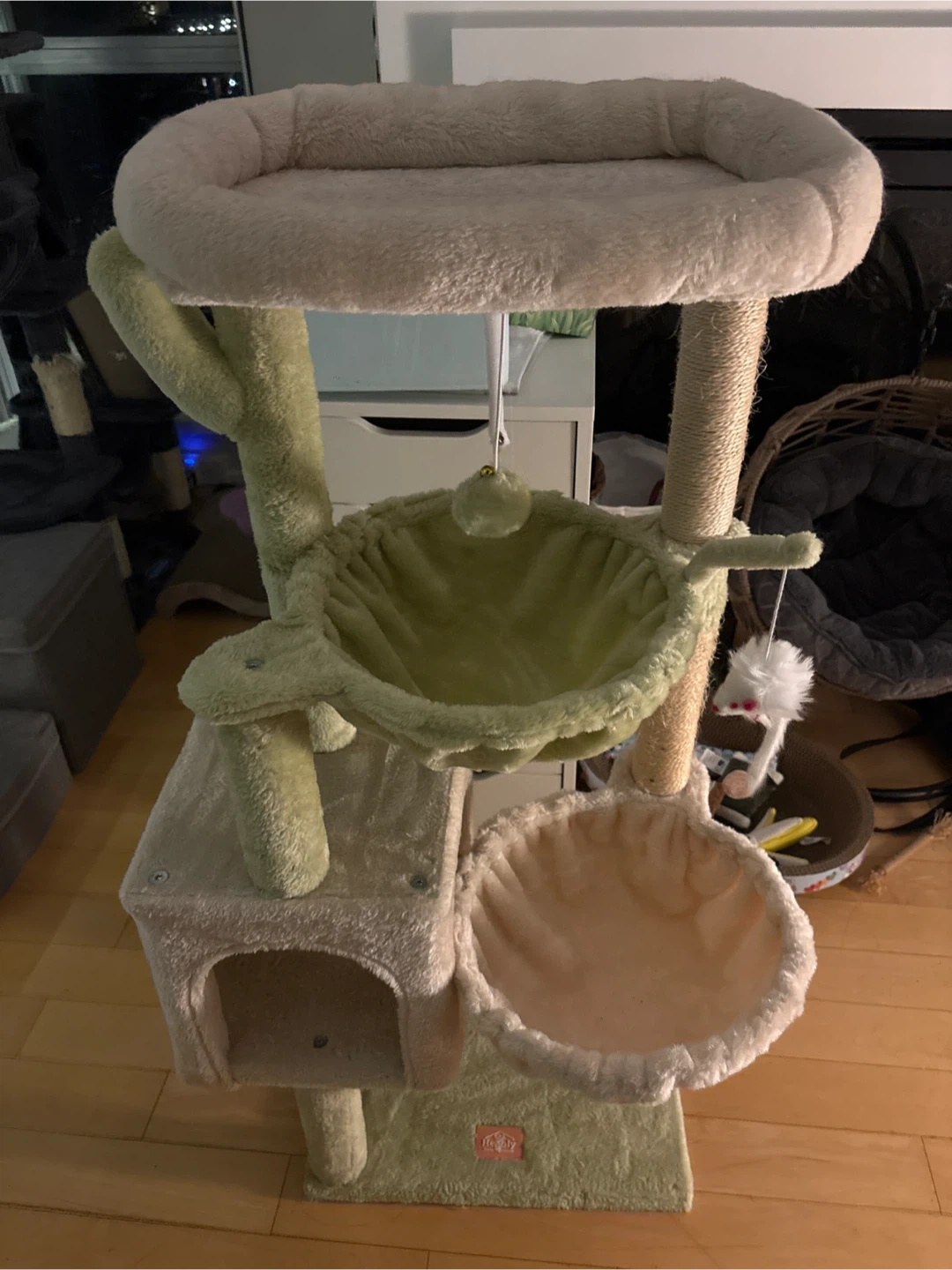 This multi-level cat tree condo offers a fun and engaging space for your feline friends. It features multiple perches, a hammock, and a cozy hideaway. The sisal rope scratching posts help keep claws healthy. It's made with plush fabric for added comfort.