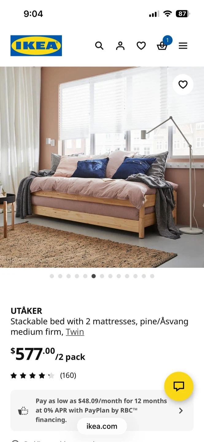 This is the IKEA UTÅKER stackable bed frame with two medium-firm Åsvang twin mattresses. It's made of pine and is designed for space-saving. The frame measures 195 cm long and 100 cm wide. It's great for small spaces or guest rooms!