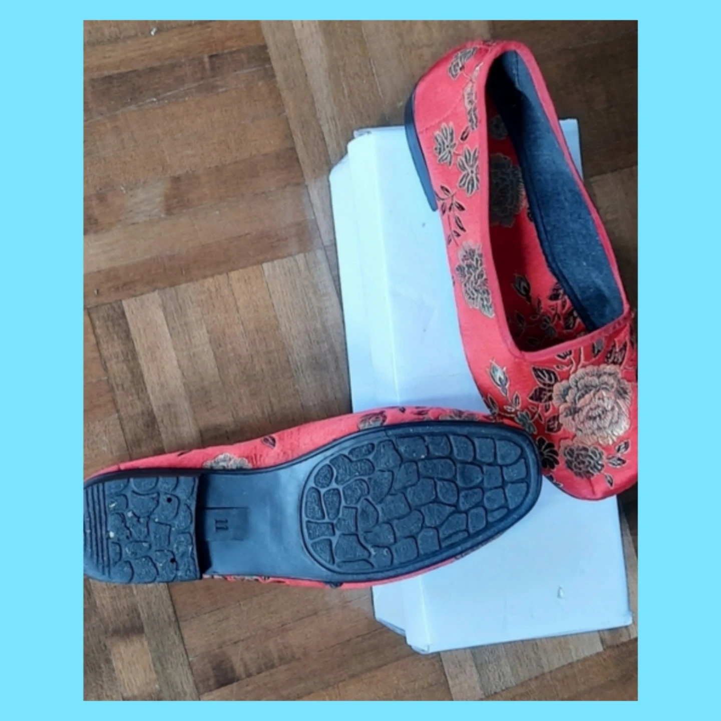 These red ballet flats feature a beautiful floral embroidery design. They're a slip-on style with a rounded toe. Fabric material.