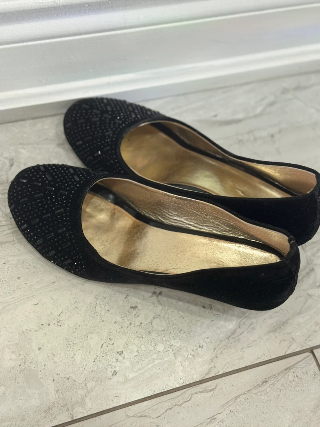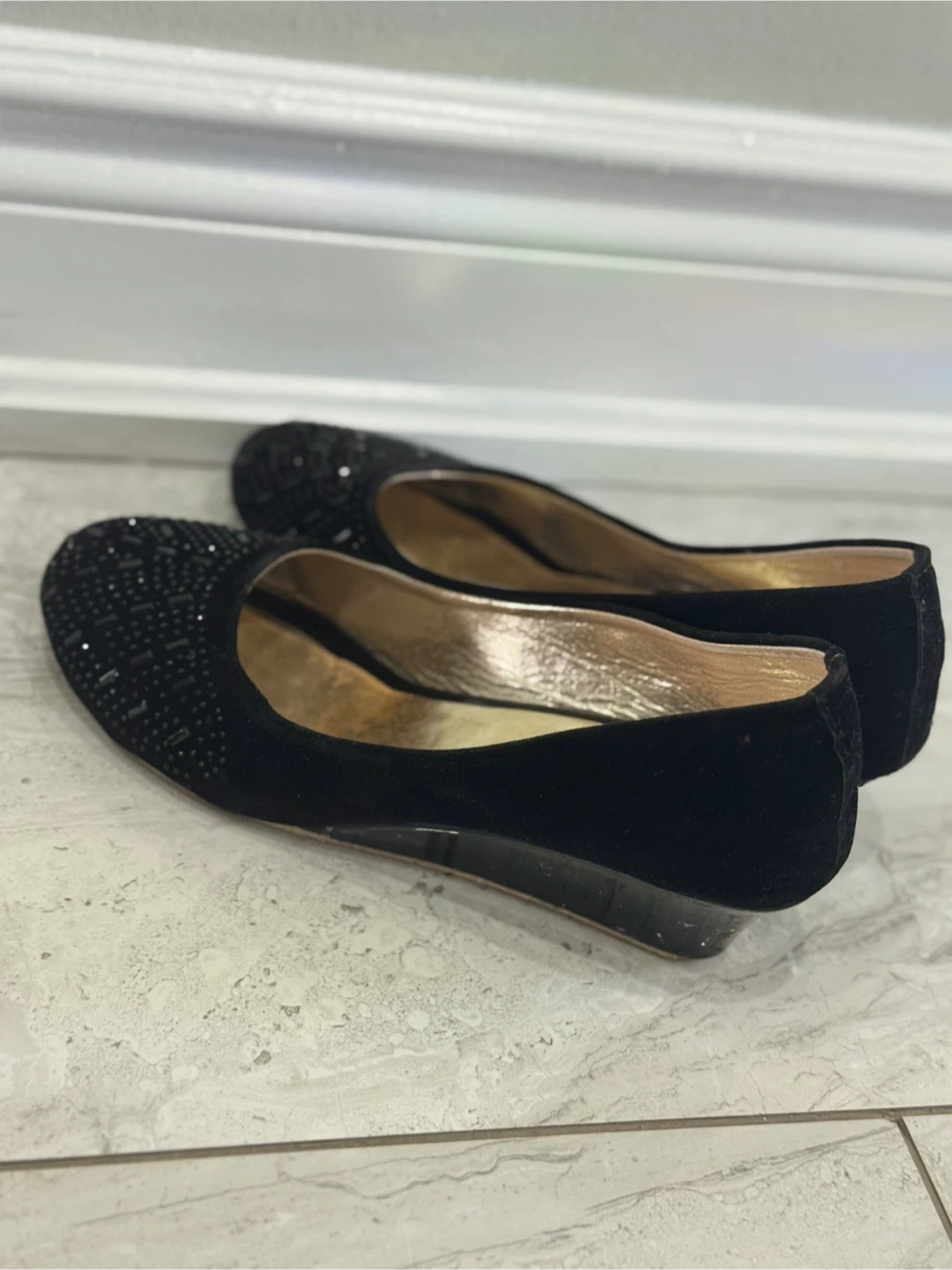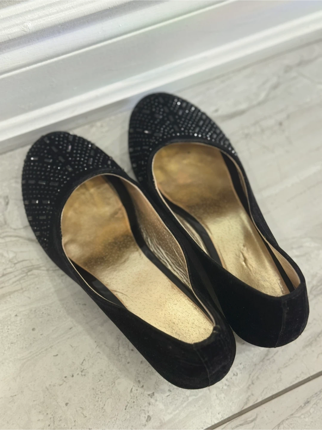 Selling a pair of black heels with stones embroidered in! They're in great condition and would be a lovely addition to your wardrobe. They have a gold-toned interior and a slight wedge heel with beautiful black stones embroidered on the front! Go well with all outfits and can be a perfect gift too!