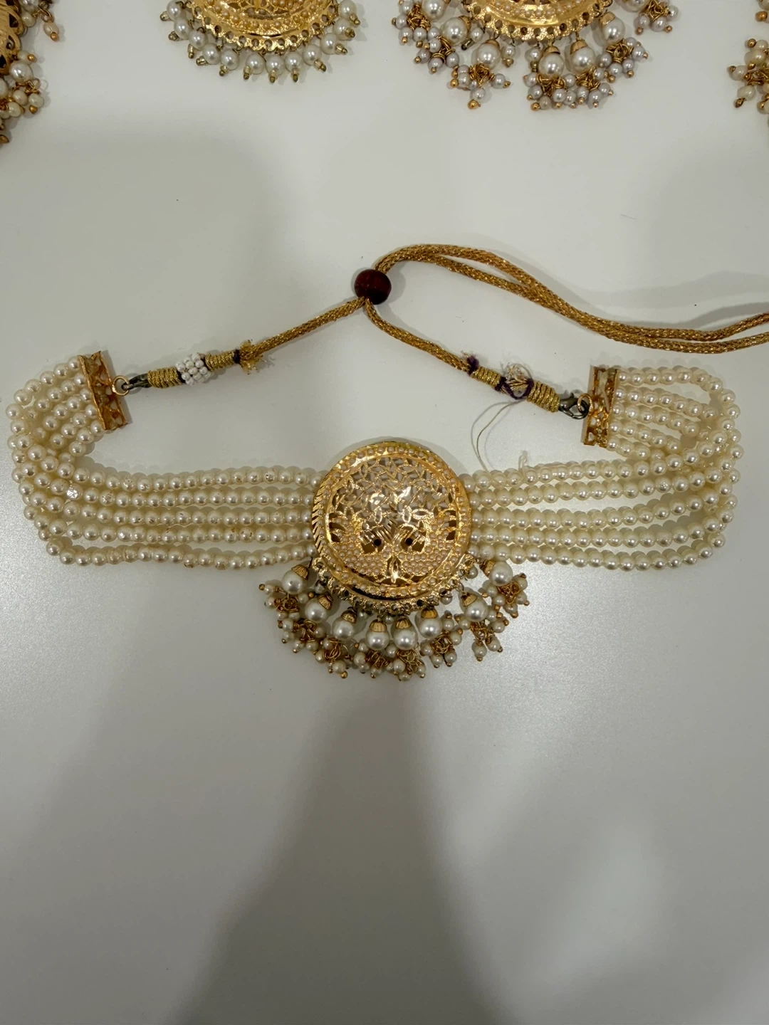 Gold Tone Pearl Jhumka Earrings and Choker Necklace Set