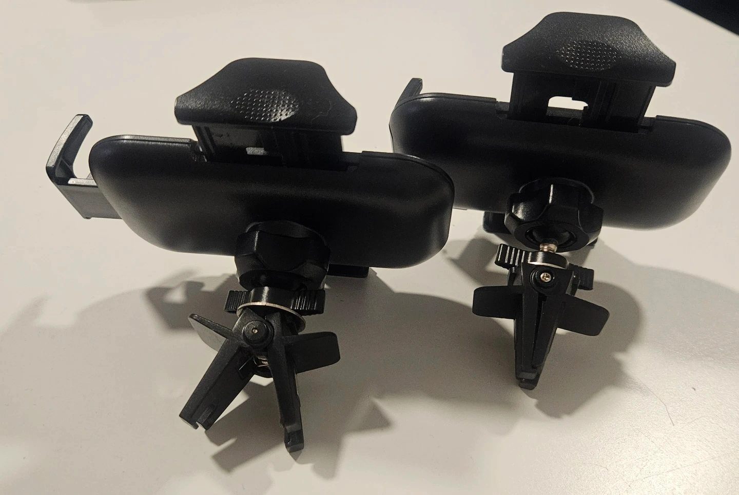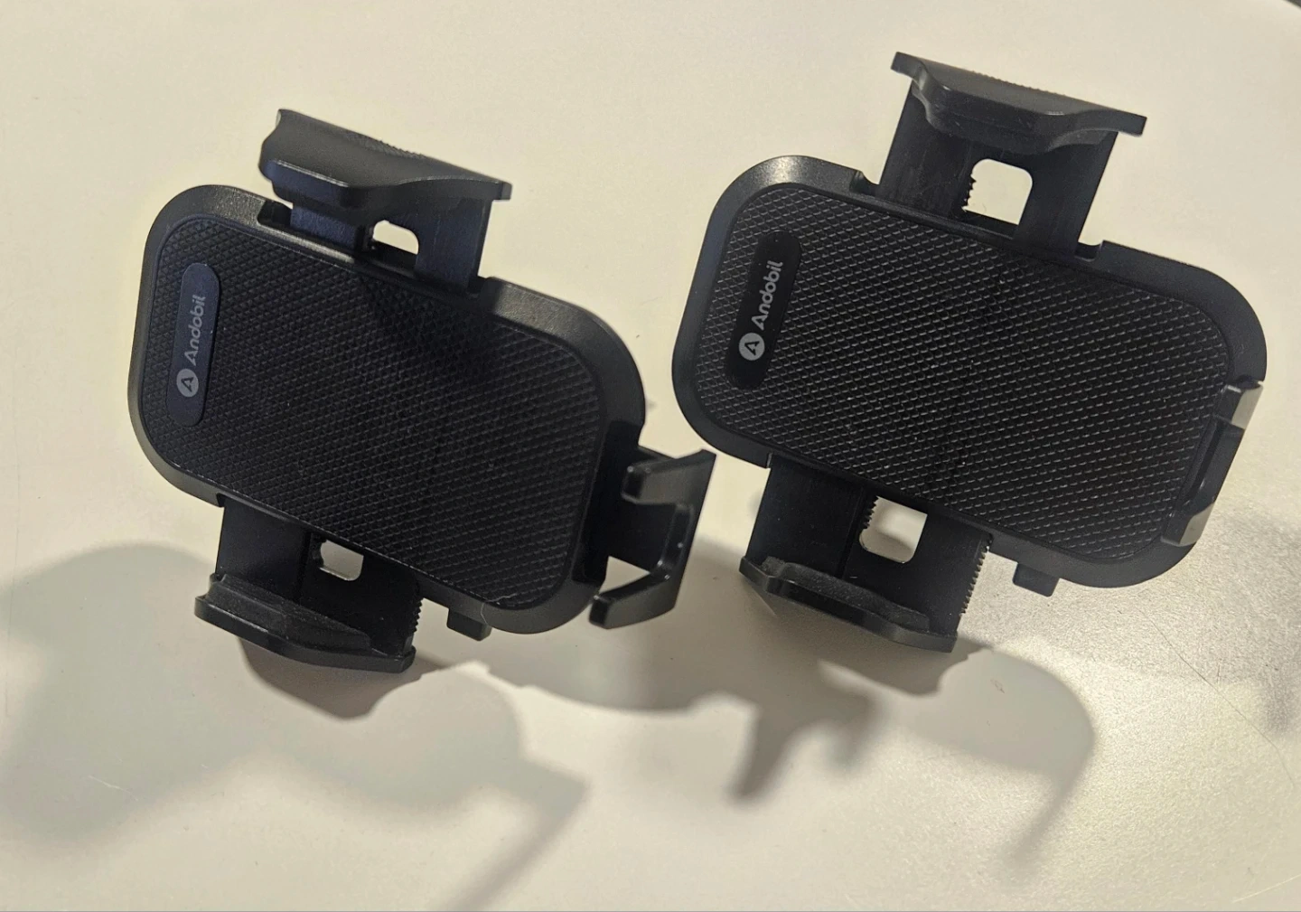 Selling two black Andobil car phone mounts. These mounts feature a secure clip for air vents and a sturdy grip for phones. They're made of durable plastic.