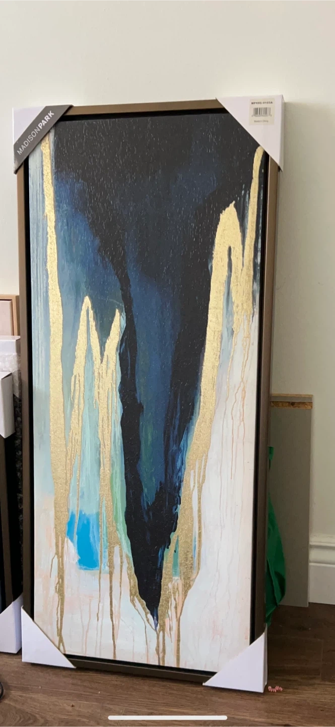 Madison Park abstract wall art featuring gold drips on a dark blue and white background. It's framed and comes in its original packaging. Adds a modern touch to any room!