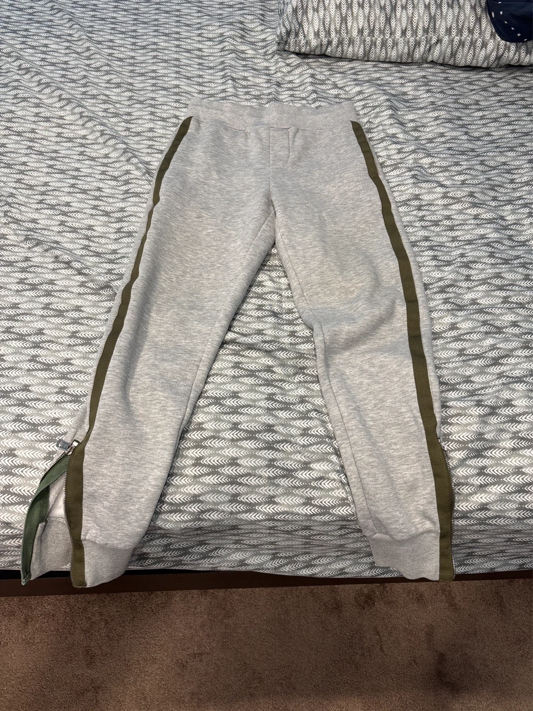Grey Moncler sweatpants with green side stripe detail and zipper cuffs. Made from soft fleece material. Size medium.