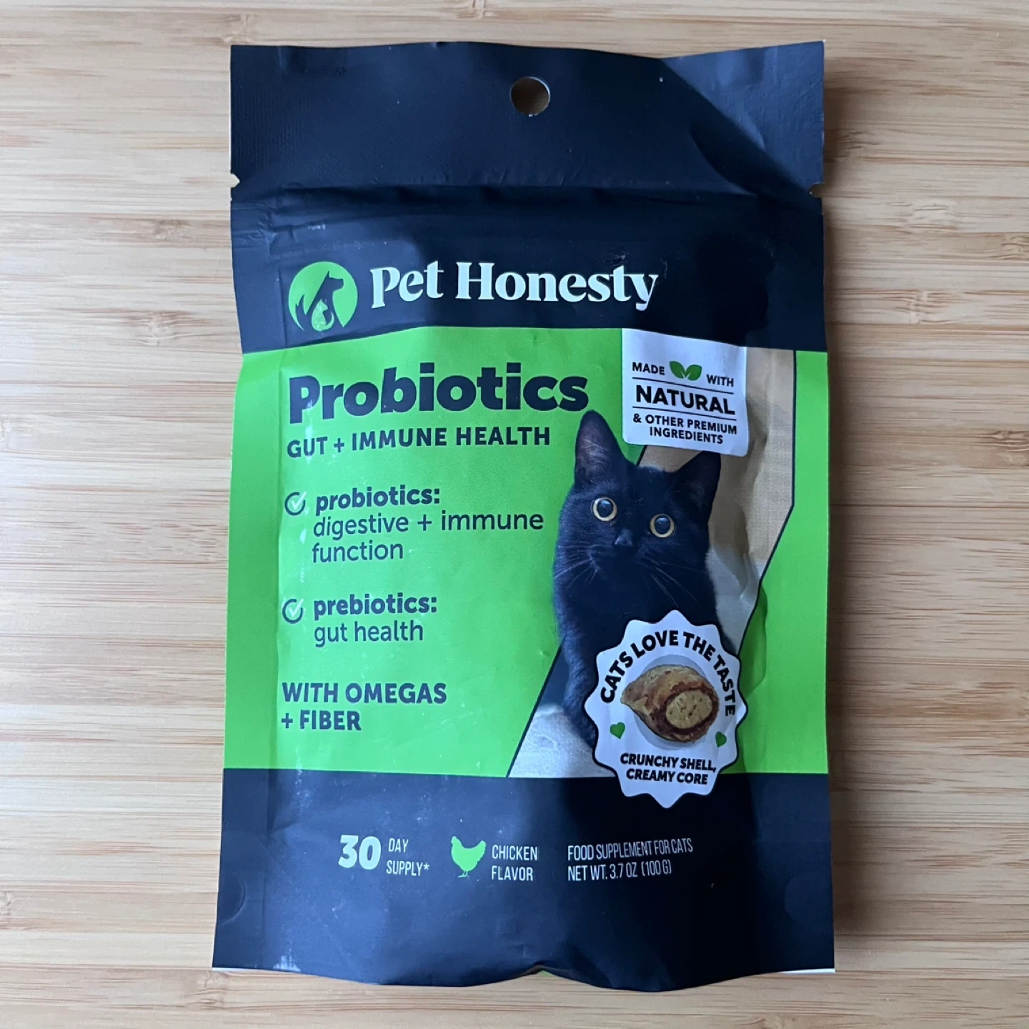 Brand new and still sealed. This is a 30-day supply of Pet Honesty probiotics for cats, featuring a chicken flavor. It's made with natural and other premium ingredients to support digestive and immune function. Contains omegas and fiber for gut health. For use in cats only.
