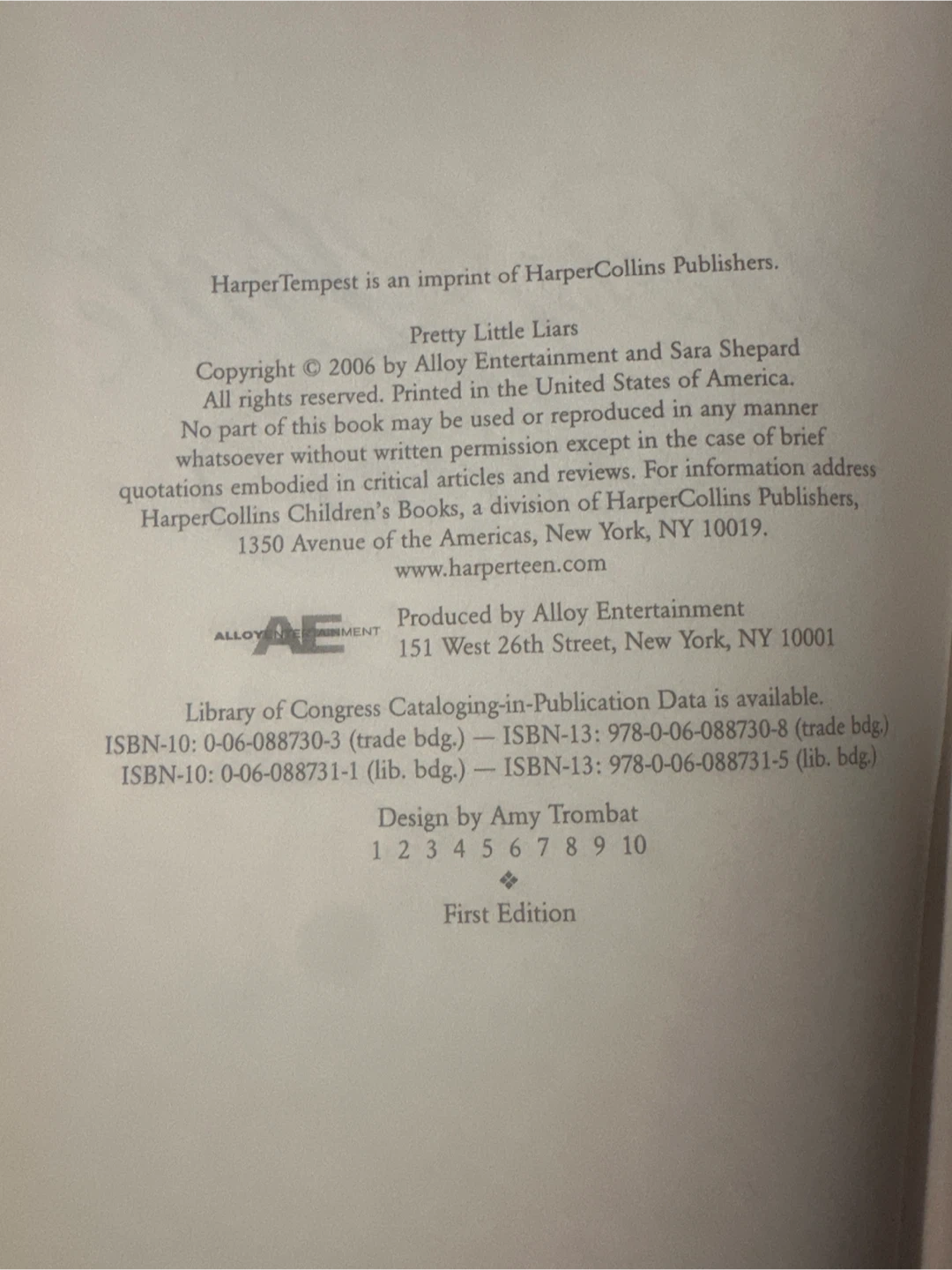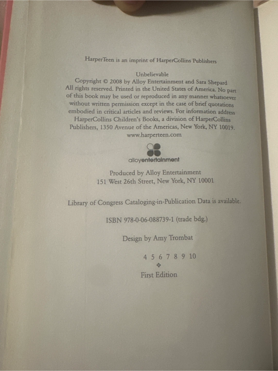 Two books from the Pretty Little Liars series by Sara Shepard. "Pretty Little Liars" is a first edition copyrighted in 2006, and "Unbelievable" is a first edition copyrighted in 2008. Both are published by HarperCollins. Both are first editions one has writing on the front cover tracing the title the other one there’s no writing on it