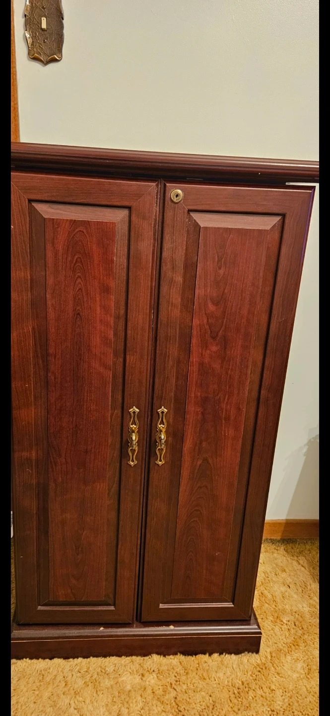 This rich, dark wood media cabinet offers ample storage for your DVD, Blu-ray, and game collection. Its doors keep everything tidy and dust-free. It's a great solution for organizing your entertainment.
