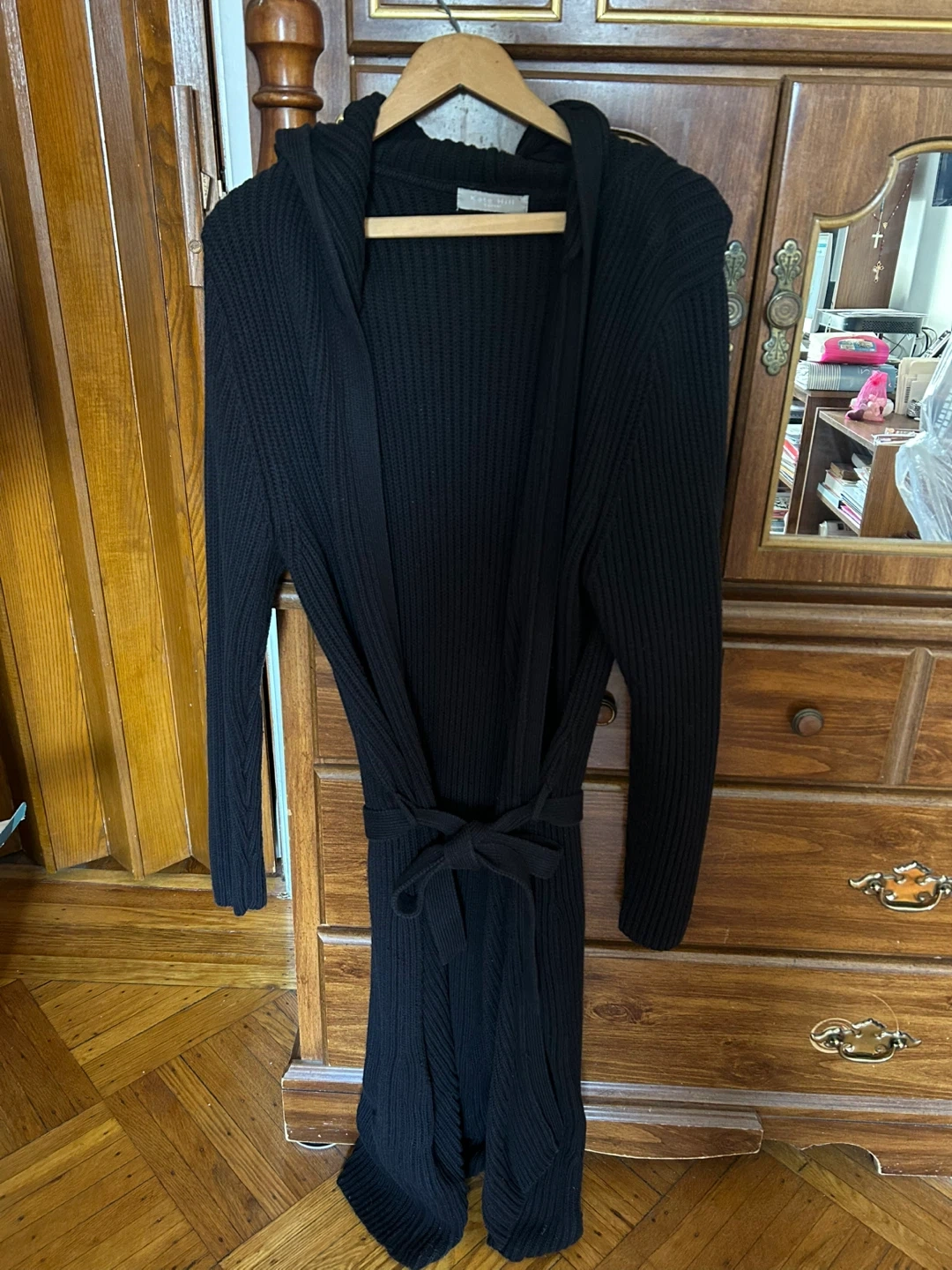 This is a black, ribbed knit, long-sleeved cardigan dress. It features a hood and a matching tie belt. The dress is midi-length with a flowing hemline.