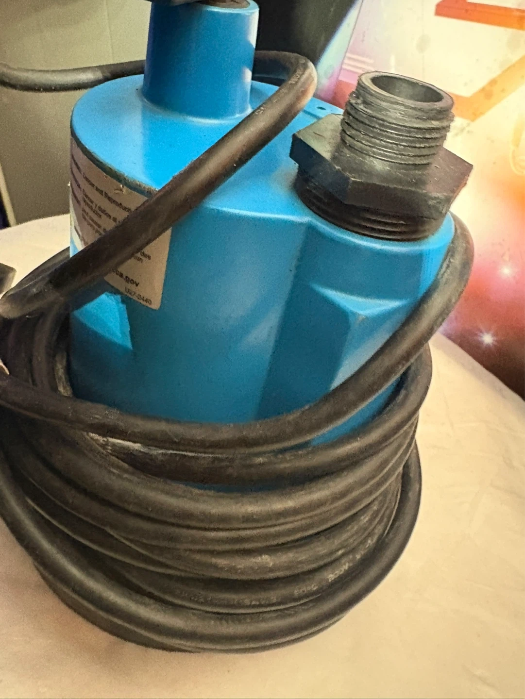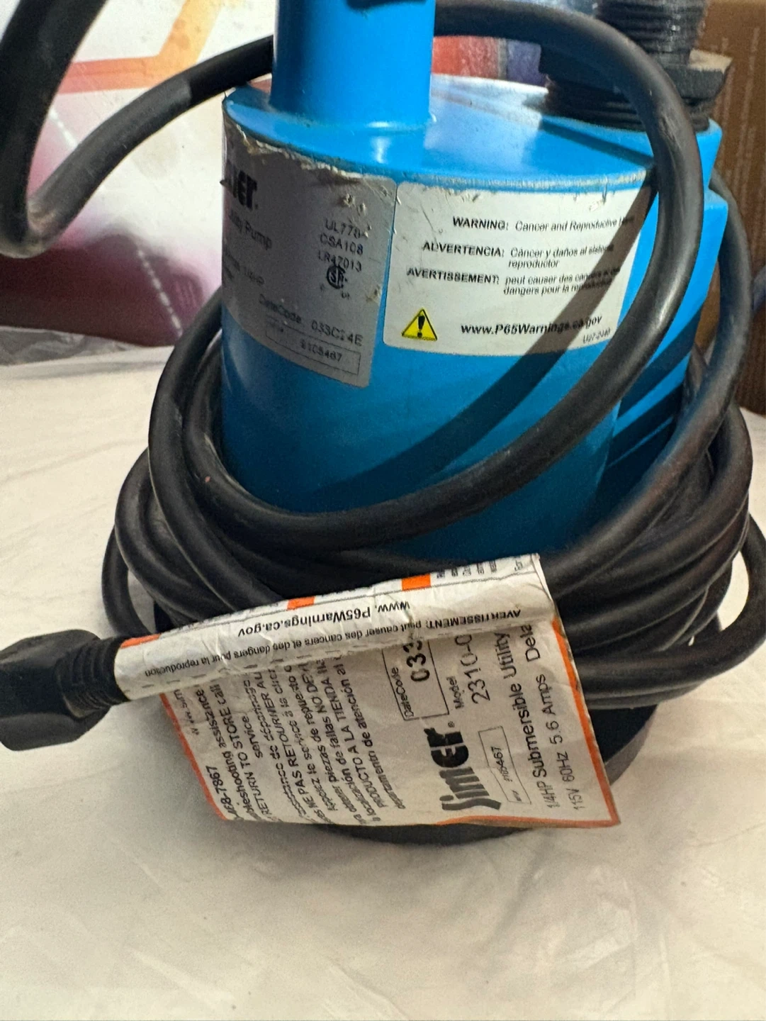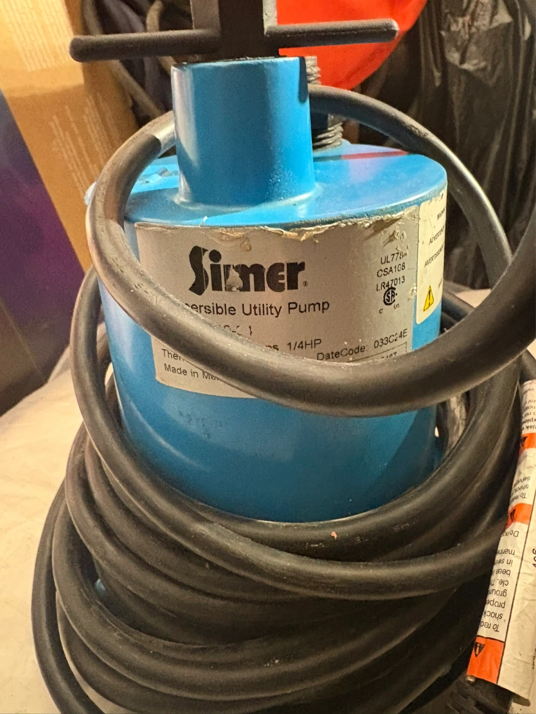 This is a Simer 1/4 horsepower submersible utility pump. It operates at 115V, 60Hz and uses 5 Amps. Made in Mexico.