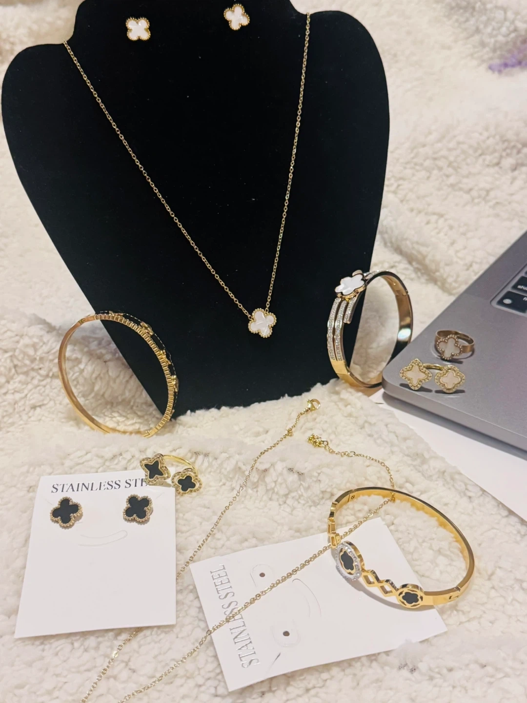 Elegant gold-tone necklace and matching earrings featuring a clover design. Some pieces are marked 'Stainless Steel'. A lovely set for everyday wear or special occasions!