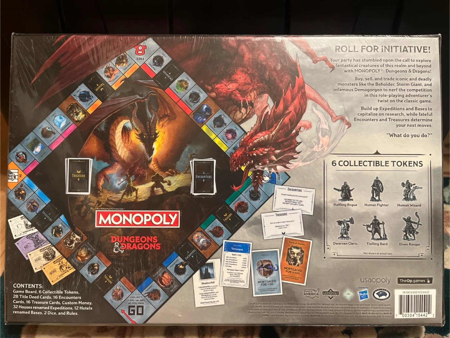 It's the classic property trading game with a Dungeons & Dragons twist! Explore fantastic creatures and realms. Includes 6 collectible tokens, dice, money, and game components. Ages 8 to adult.
