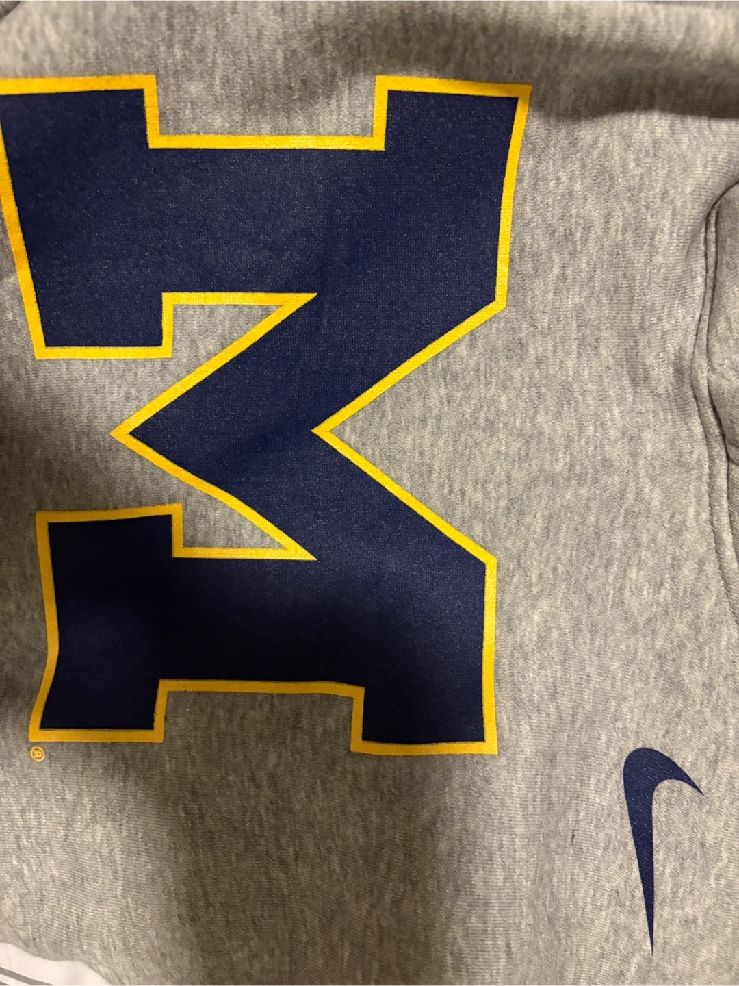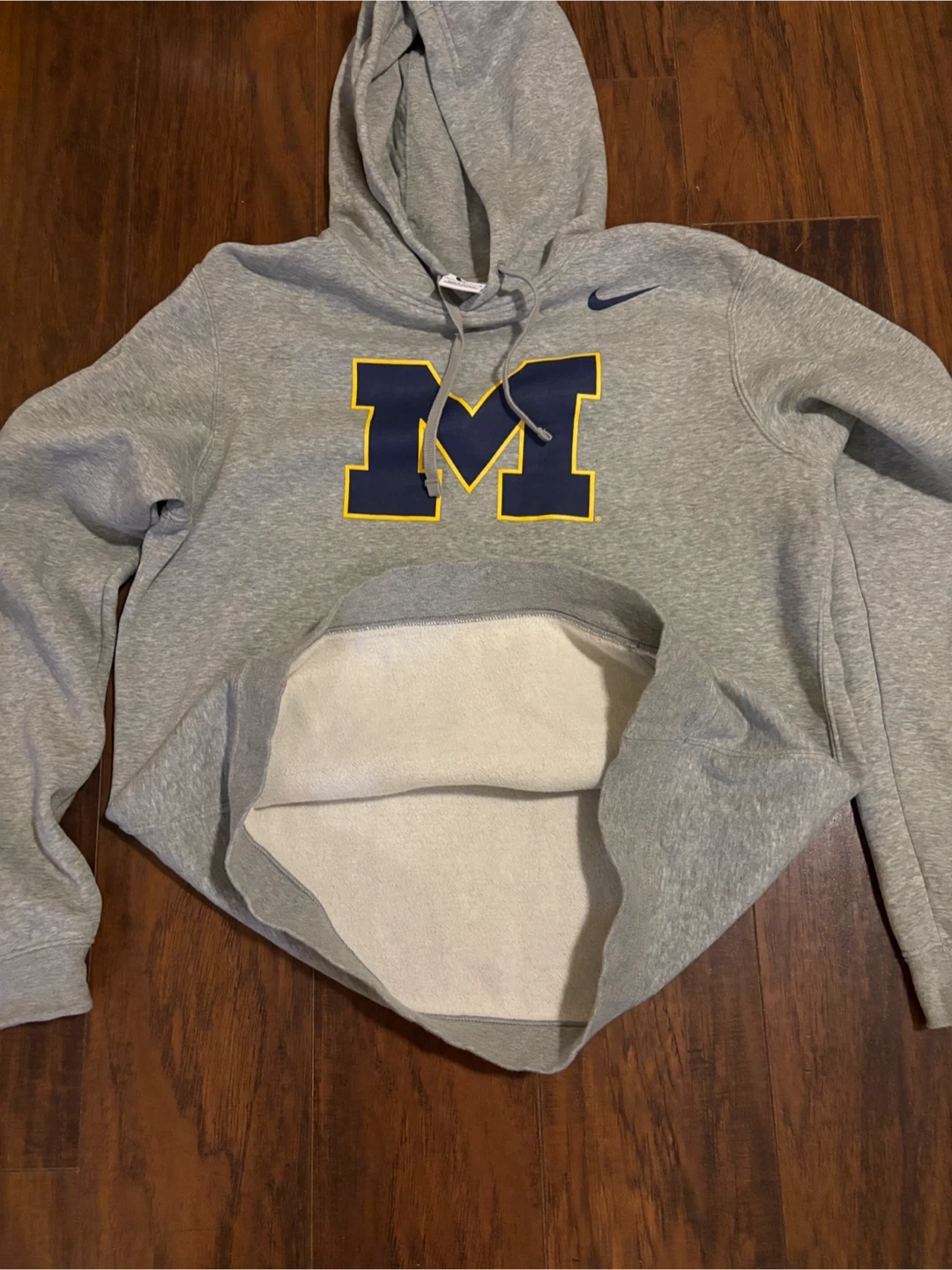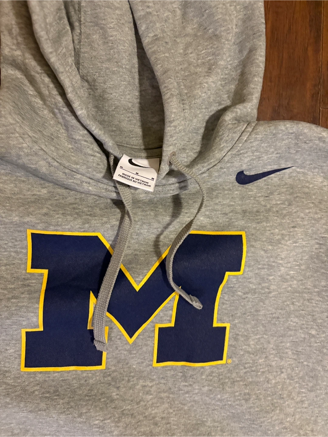 Grey Nike pullover hoodie featuring the Michigan Wolverines "M" logo on the front. It's made from a comfortable cotton blend. Size medium.