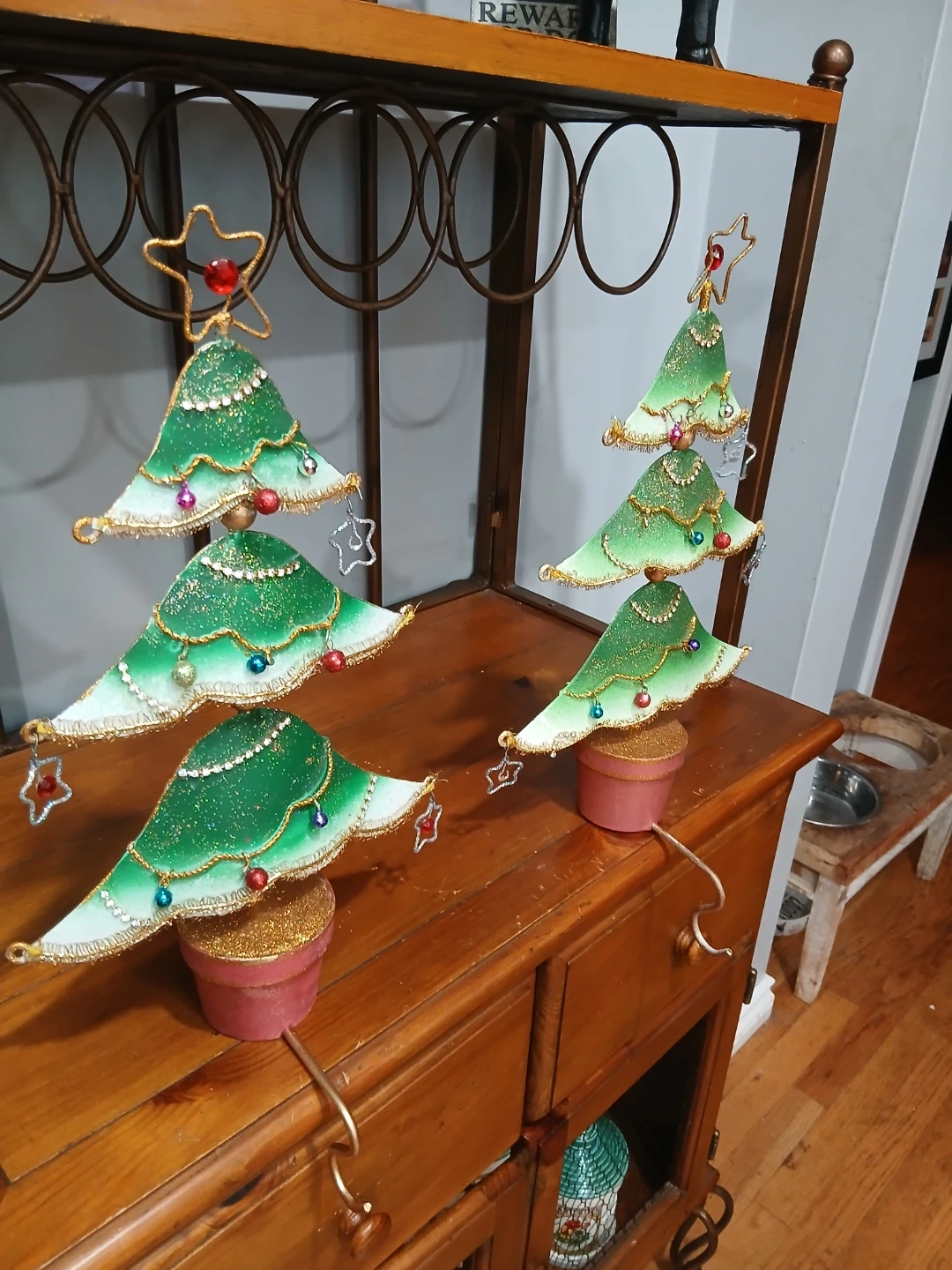 Vintage Bombay CompanyThese adorable Christmas tree stocking holders are perfect for adding a touch of festive charm to your holiday decor! They are in great condition and ready to hold your favourite Christmas stockings. They would look great on a mantle or shelf! Reg wear