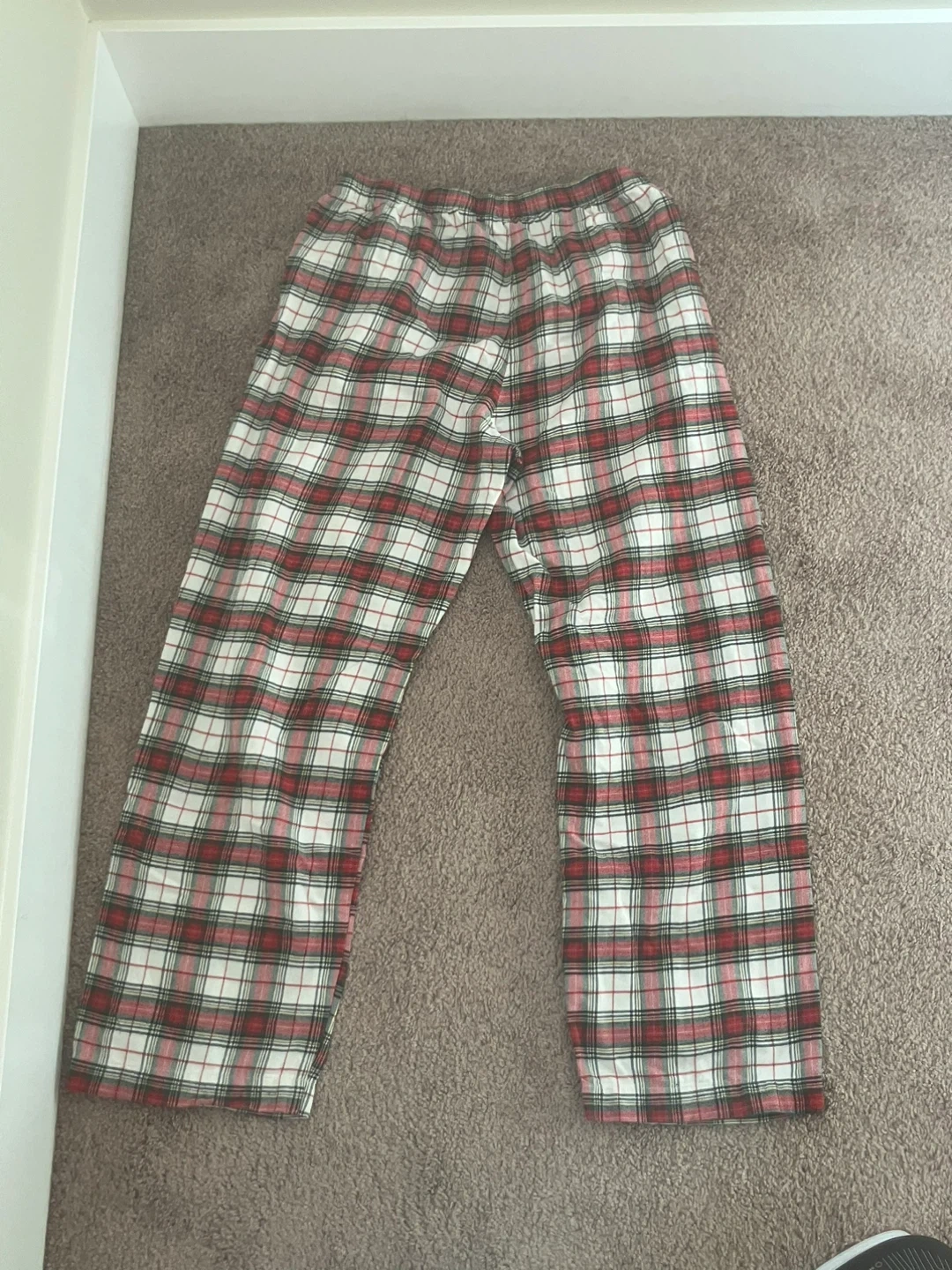 Comfortable GapBody pajama pants in a classic red, white, and green plaid. Size S. Made from a soft fabric for a cozy feel. Elastic waistband with drawstring. Has a small paint stain on the front but isn’t noticeable and is easy to cover with a longer shirt.