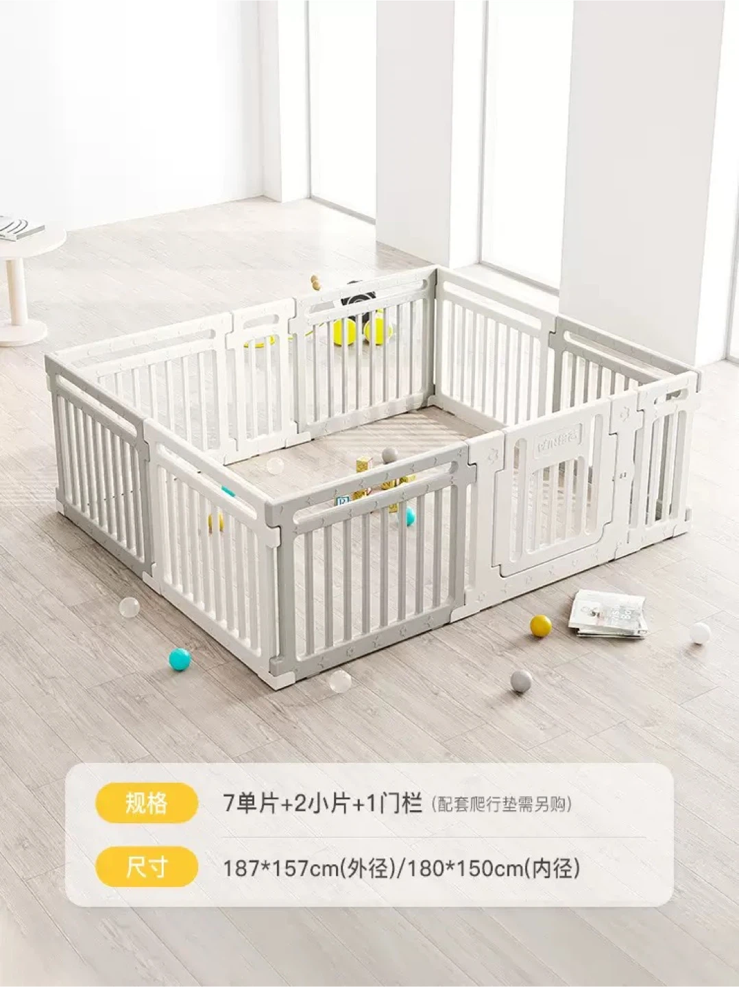 This is a white baby playpen made of 7 panels and 1 gate. Outer dimensions are 187cm x 157cm, and inner dimensions are 180cm x 150cm. Play mat sold separately. Great for keeping little ones safe!