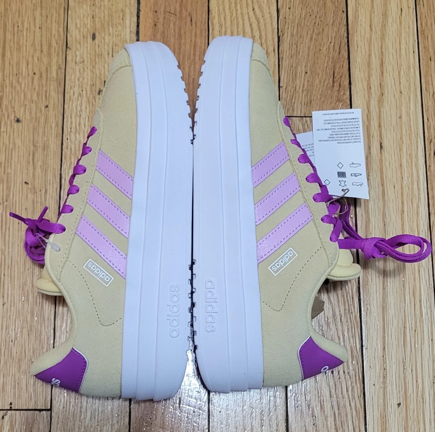 Adidas VL Court Bold J platform sneakers in a tan and purple colorway. Features a suede upper and platform sole. Size US 4.5 (UK 4, FR 36.5, JP 230, CHN 225).