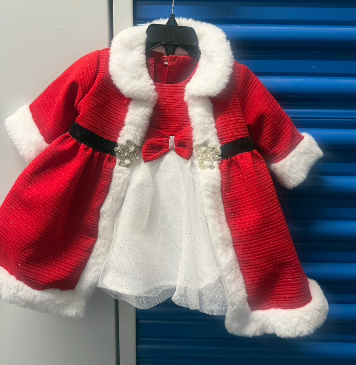 This adorable baby girl dress comes with a matching festive coat. The dress features a sparkly white tulle skirt and a red glittery bodice with a bow. The coat is red with white faux fur trim. Perfect for holiday parties!