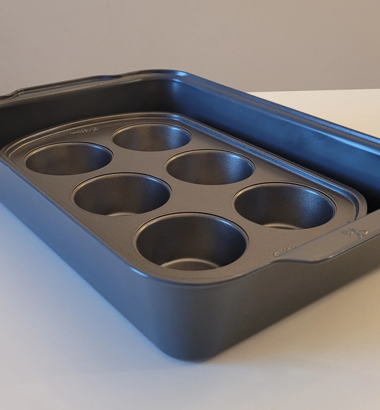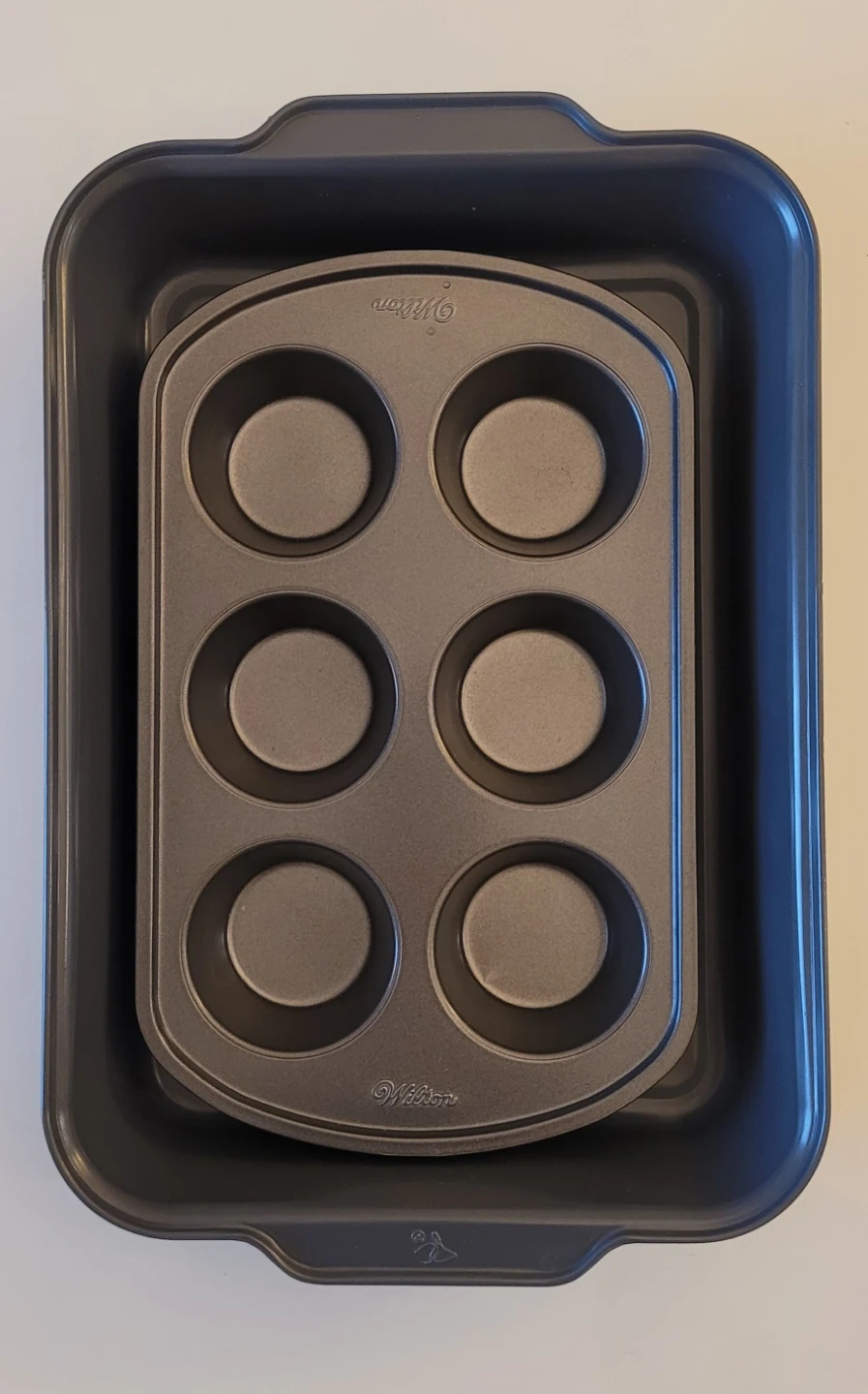 This set includes a Wilton 6-cup muffin pan nested inside a dark grey baking pan. It's made of metal for even baking. These pans are great for making muffins or cupcakes!