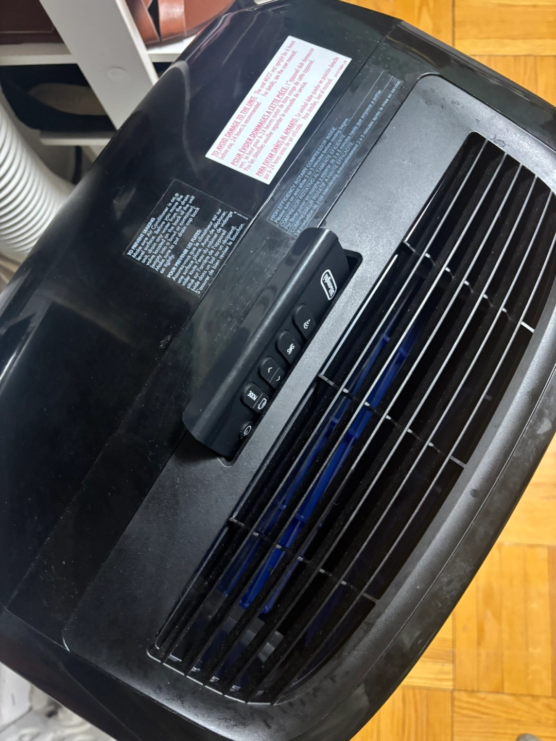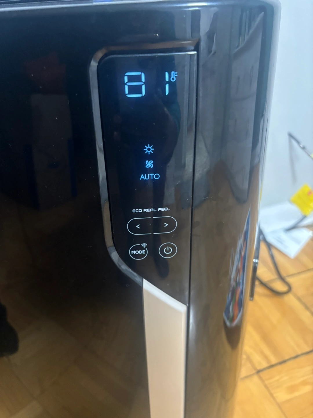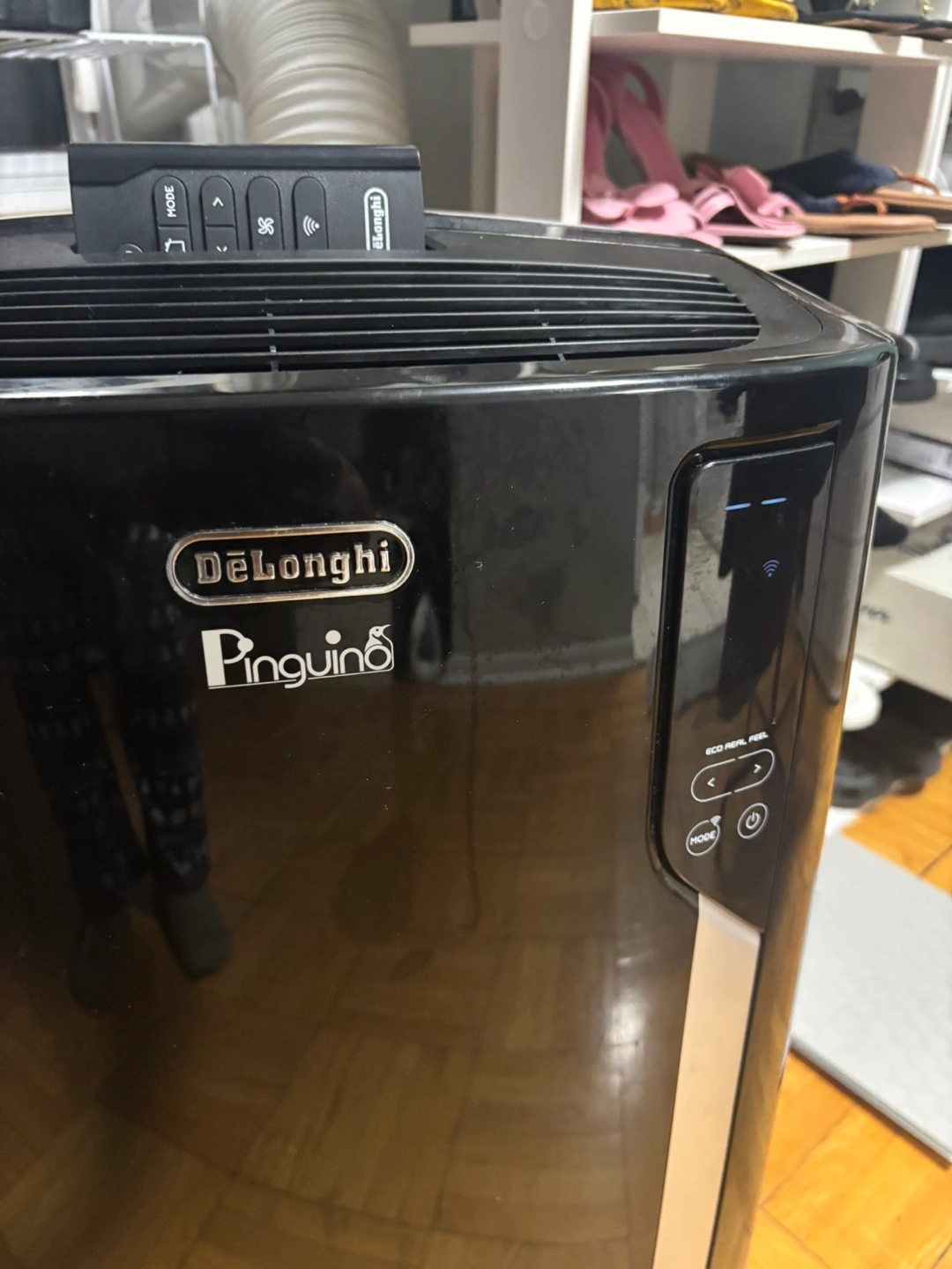 Black portable air conditioner. Includes remote control. Digital display. ECO REAL FEEL function. Multiple modes. Like-new DeLonghi 4-in-1 Pinguino Deluxe Portable Air Conditioner, used for just 2 months during summer. This versatile and powerful unit offers cooling, heating, dehumidifying, and fan modes.