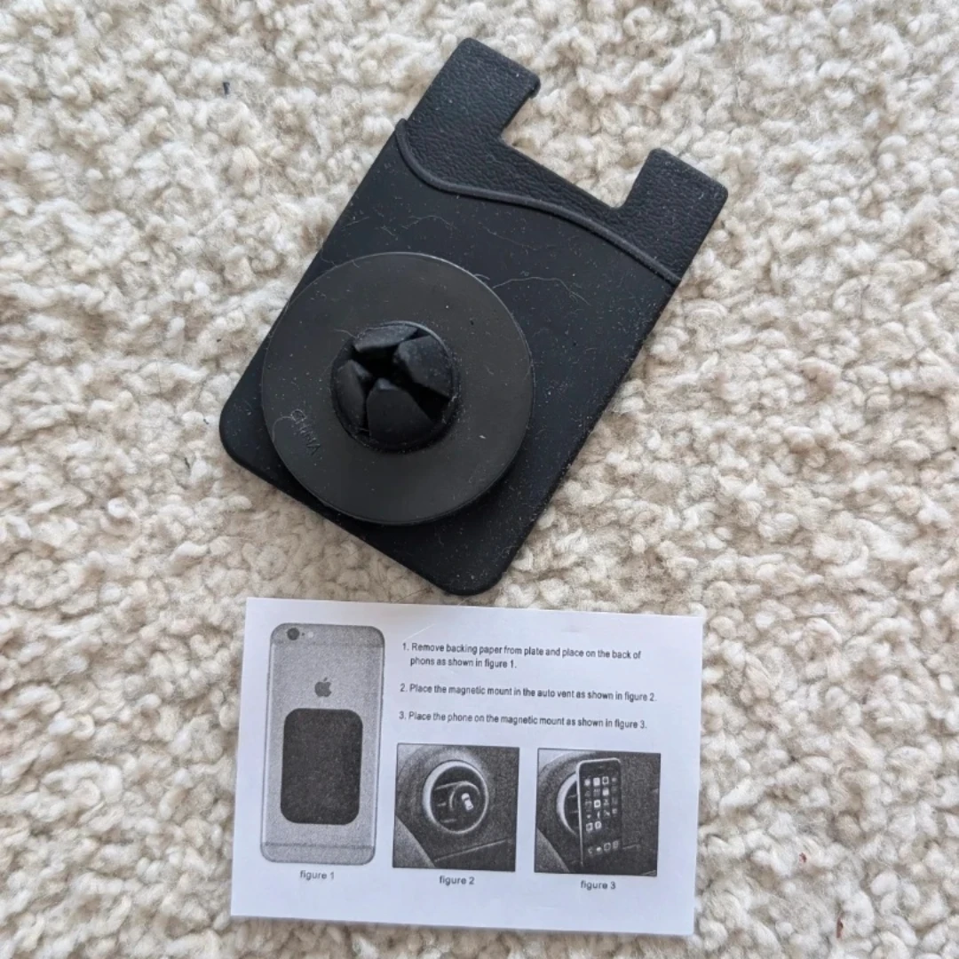 This is a handy black phone wallet with a mount. It's designed to stick to the back of your phone and then attach to a mount, like in your car's vent. Instructions are included!