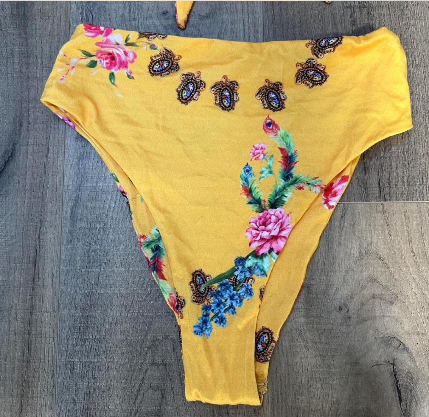 Bright yellow bikini set with a bold floral print. Features a tie-front top and high-waisted bottoms. Made with a stretchy fabric for comfort. Size small, worn as seen in last photo!