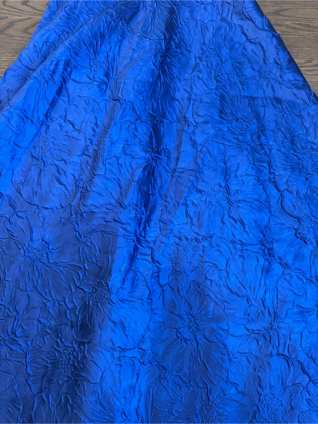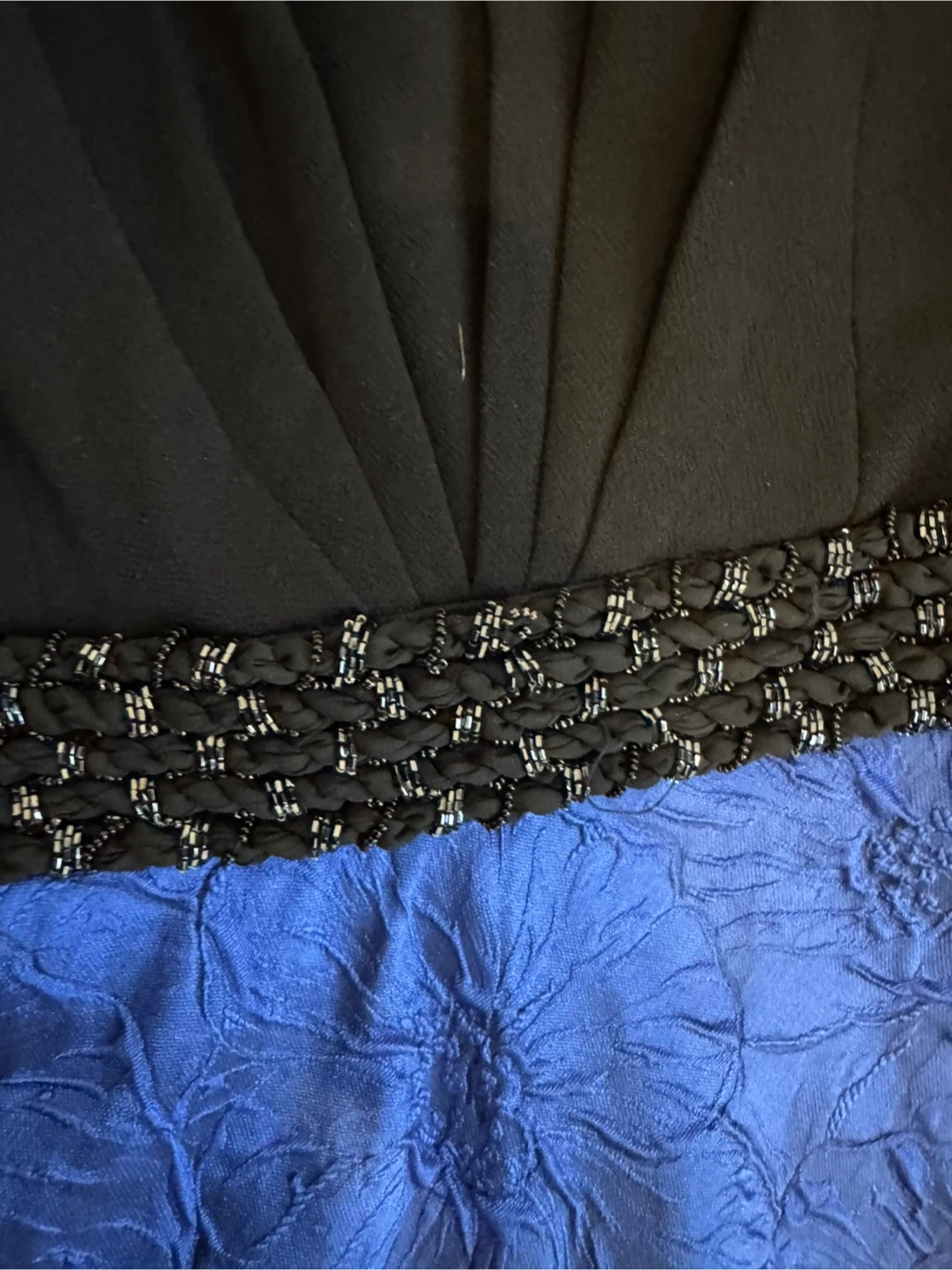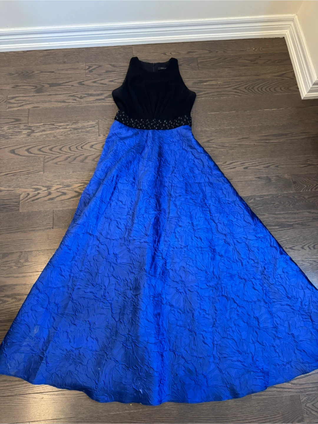 This Carmen Marc Valvo dress features a black sleeveless bodice and a vibrant blue textured skirt. It has a beaded waistband for a touch of sparkle. Size 4.