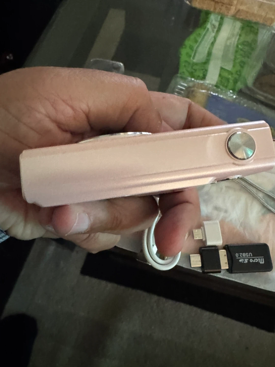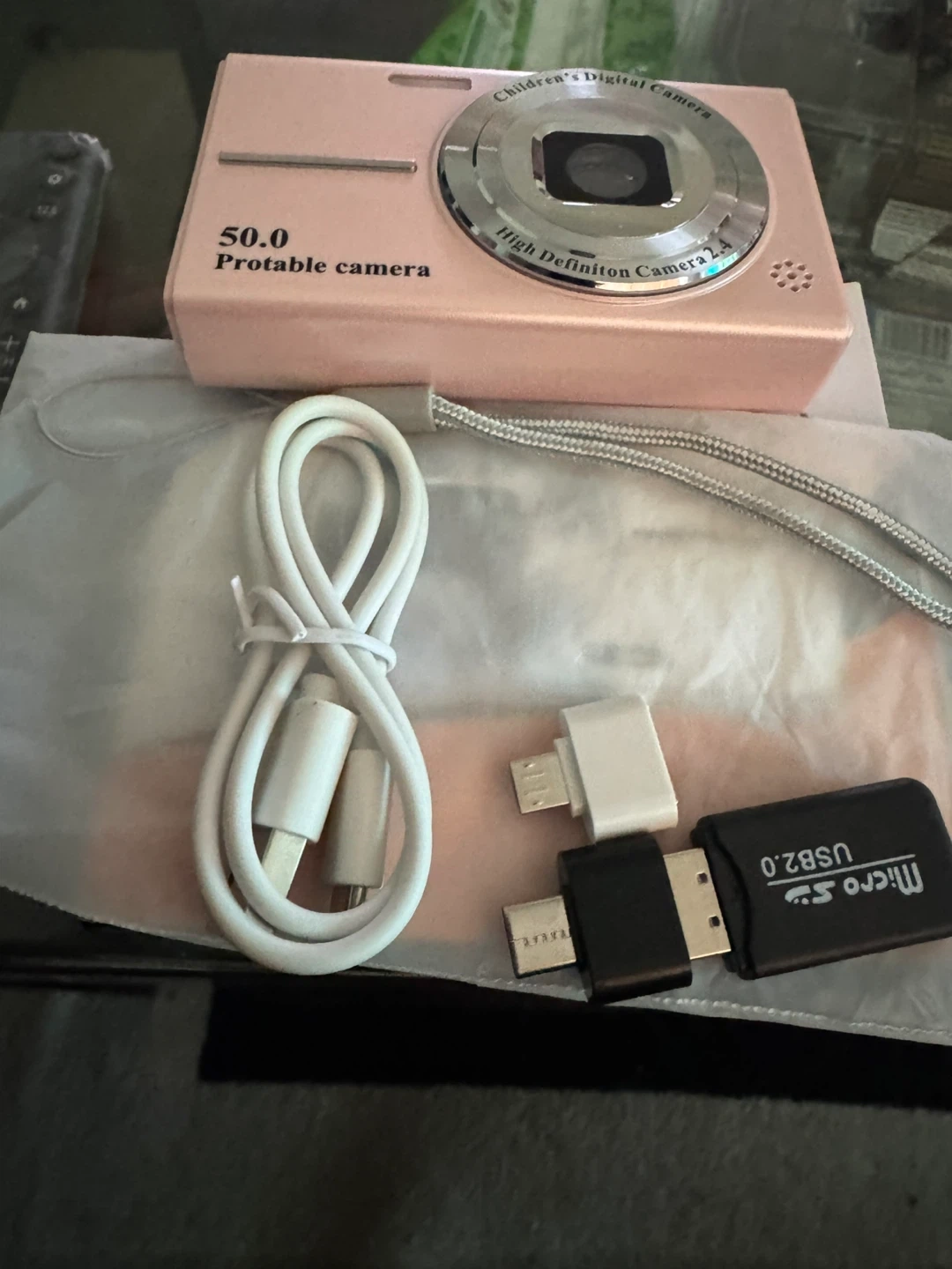 This is a pink children's digital camera. It's portable and has high definition. Comes with a USB cable and card reader.
