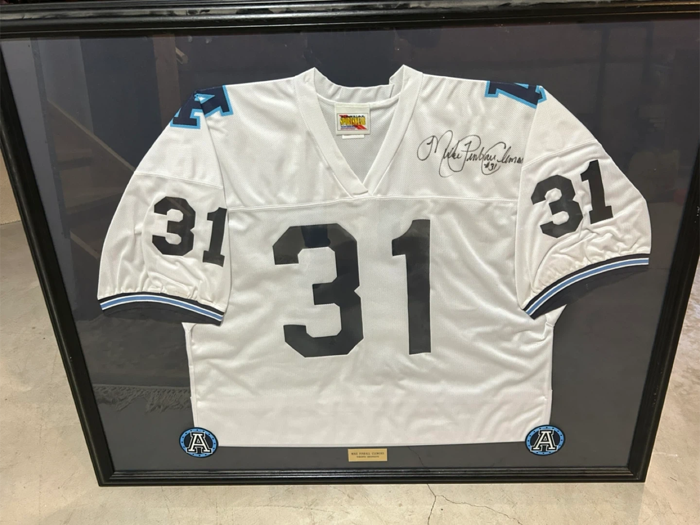Framed and signed Mike Pinball Clemons jersey. Parting with it as liquidation of my late motherinlaw’s estate. It was awarded as a prize in a seniors bowling tournament 20+ years ago.