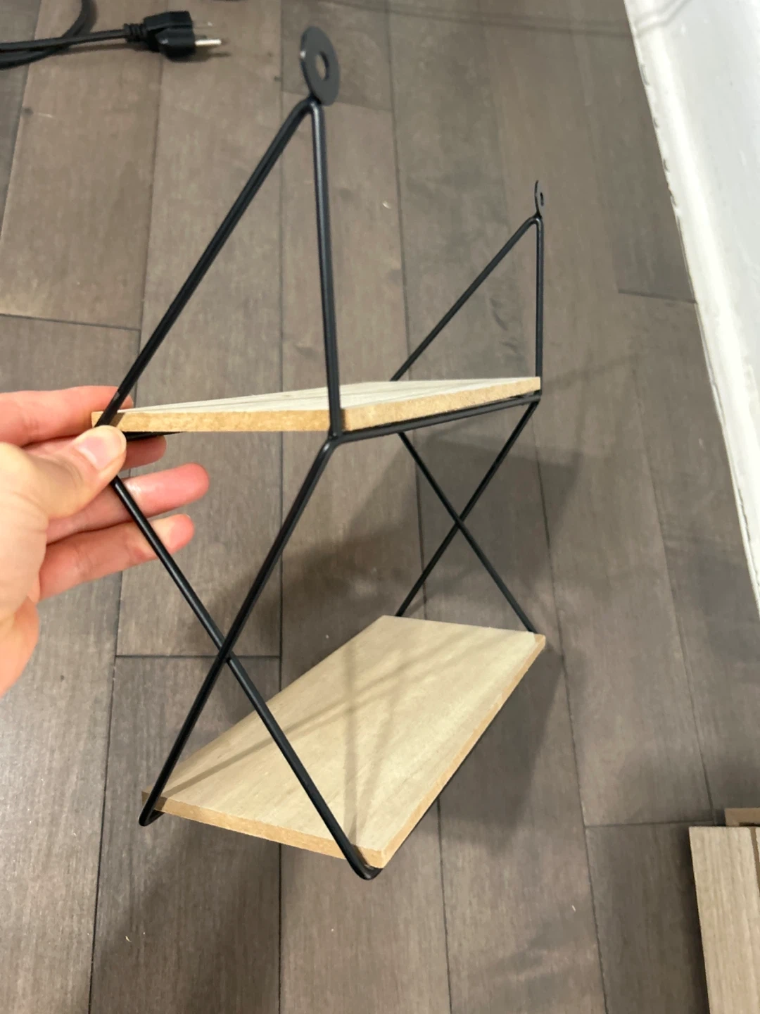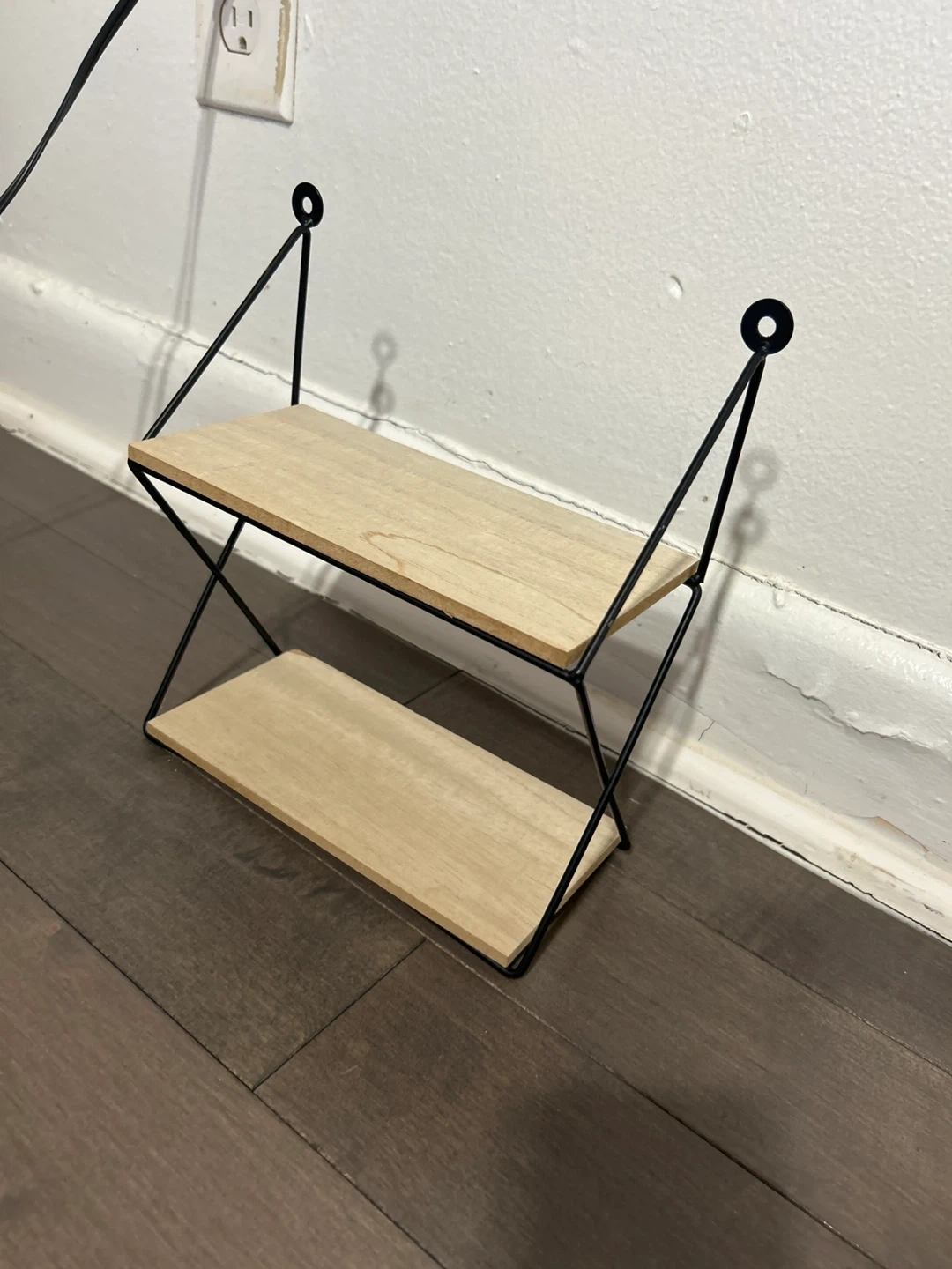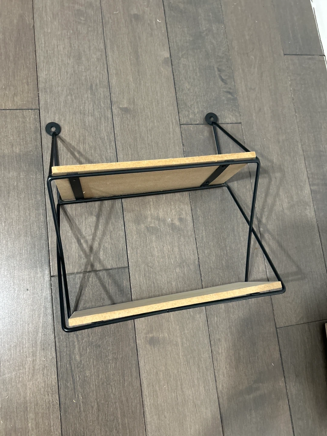 This is a two-tier floating wall shelf with a modern design. It's made with a black metal frame and light wood shelves. This shelf is great for displaying small items or for organizing essentials in any room!