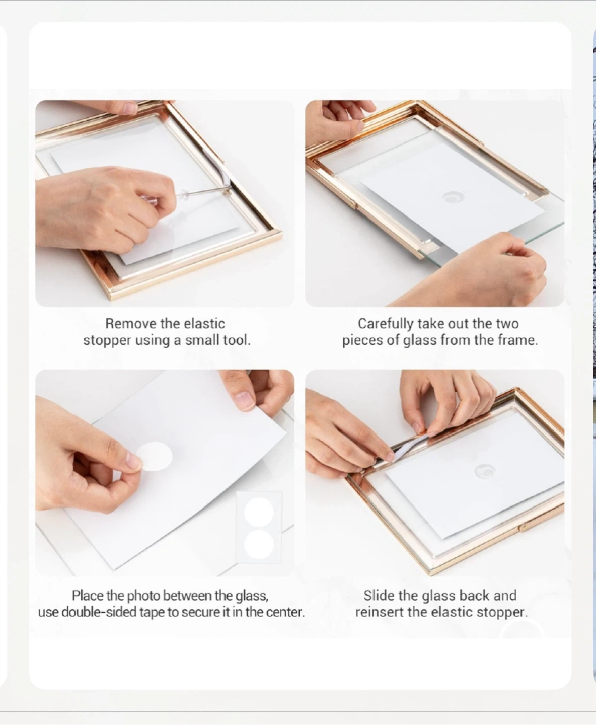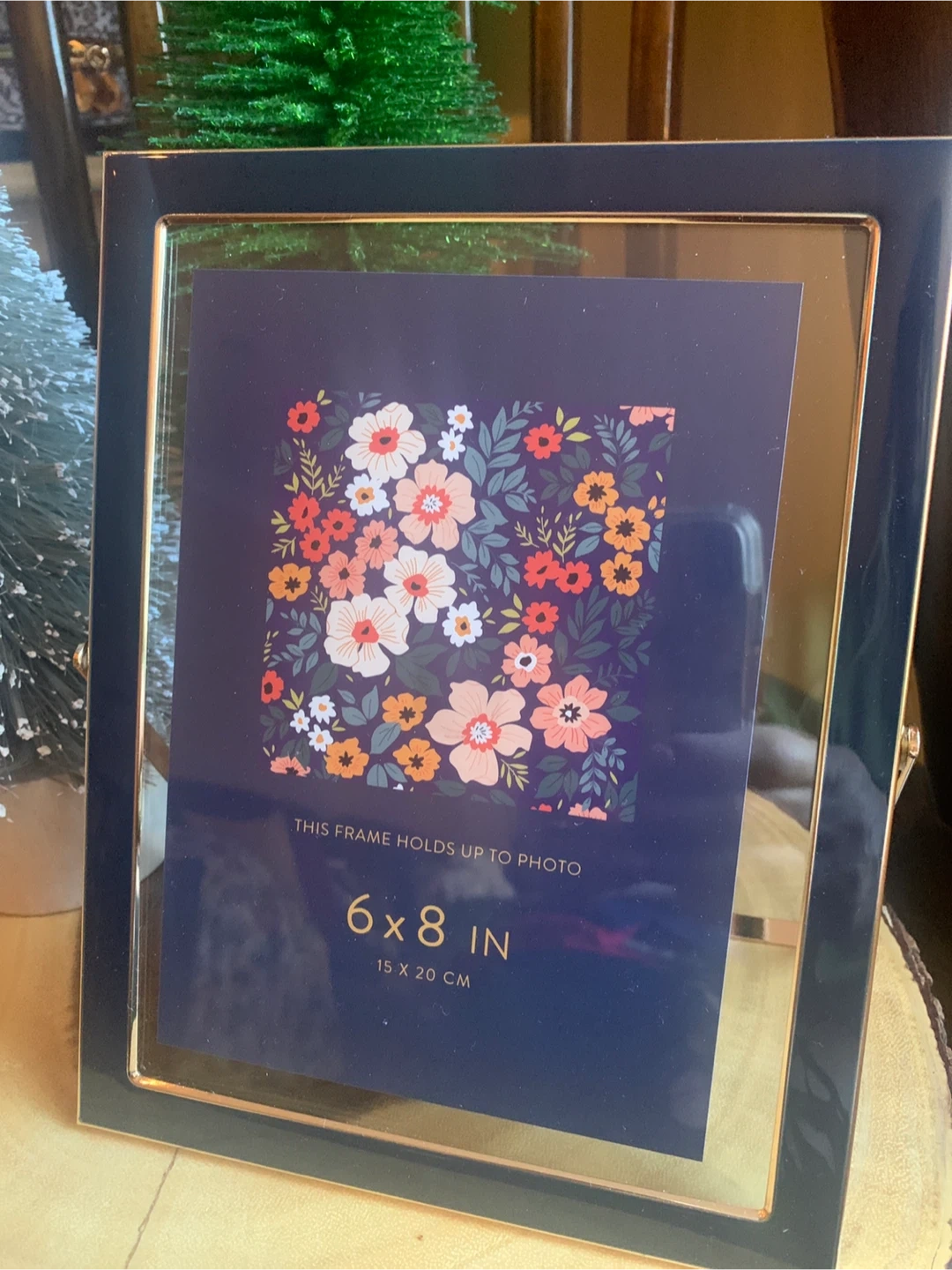 A really pretty navy blue enamel floating photo frame by Axeman! This frame is a 6x8 inch photo frame with a navy blue border and rose gold trim for the frame. The whole frame is 9” x 7”. It's suitable for displaying photos on a desk, table or shelf. Its classic easel design complements most decor.