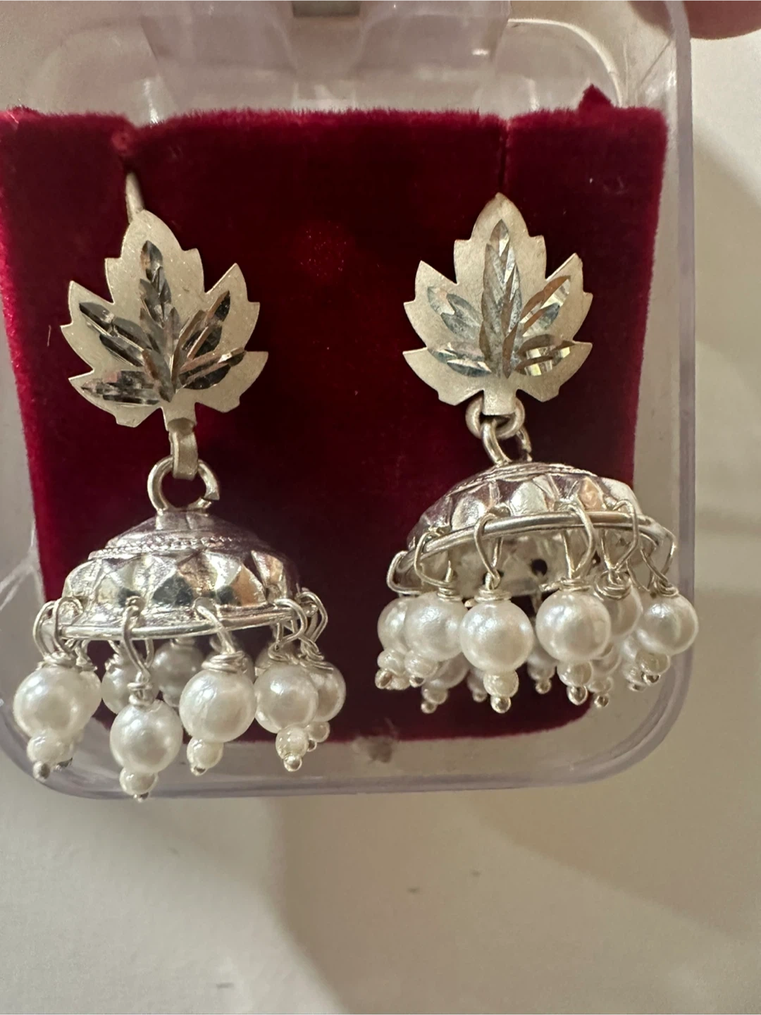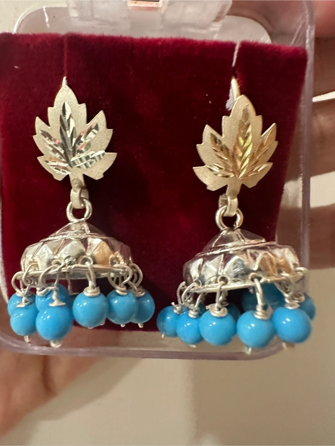 Selling a pair of beautiful jhumka earrings with a maple leaf design. They come in a variety of colours: red, blue, grey, white, and green. Perfect for adding a touch of Canadian flair to any outfit!