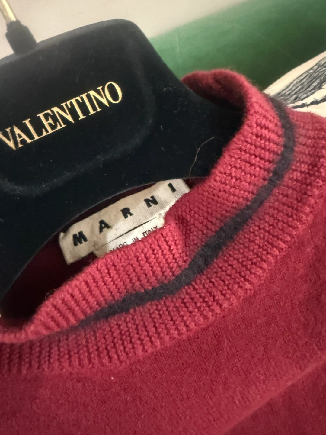 Marni monk neck wool sweater in burgundy color. It’s made with Lana wool and has mohair striped trim on the collar and cuffs. Size IT48 US M. Pick up from queens Elmhurst.