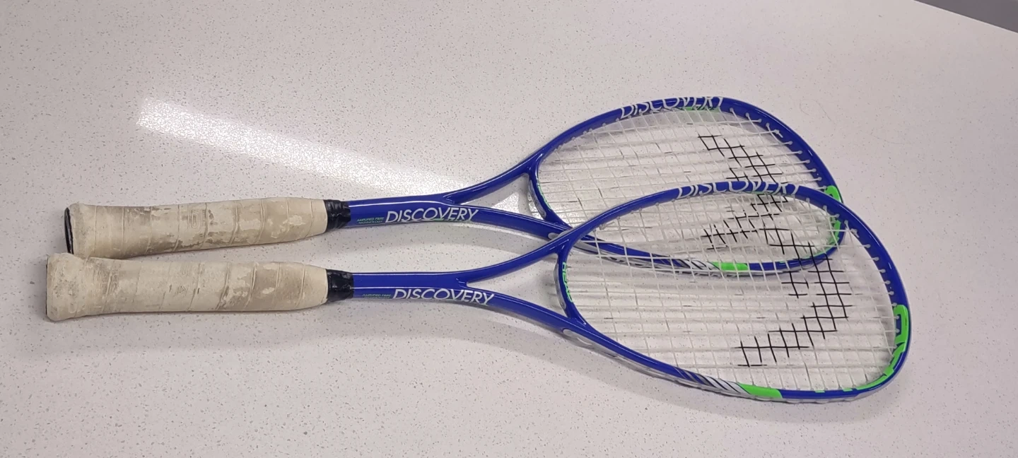 Two blue Discovery tennis racquets are available. They're great for beginner players. The frames are blue with green accents on the head.