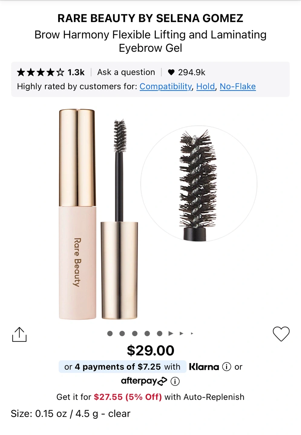 Rare Beauty Brow Harmony Flexible Lifting and Laminating Eyebrow Gel. It's a clear gel that lifts and laminates eyebrows. Size is 0.15 oz / 4.5 g. Made in Korea.