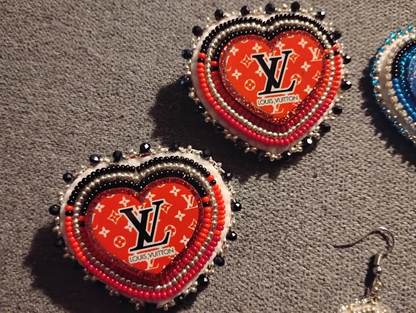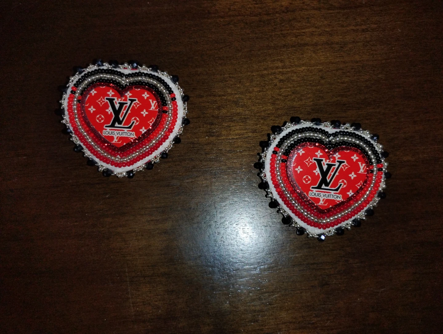 These unique, heart-shaped earrings are handmade with intricate beadwork. They feature a design inspired by Louis Vuitton patterns. Perfect for adding a touch of flair to any outfit!