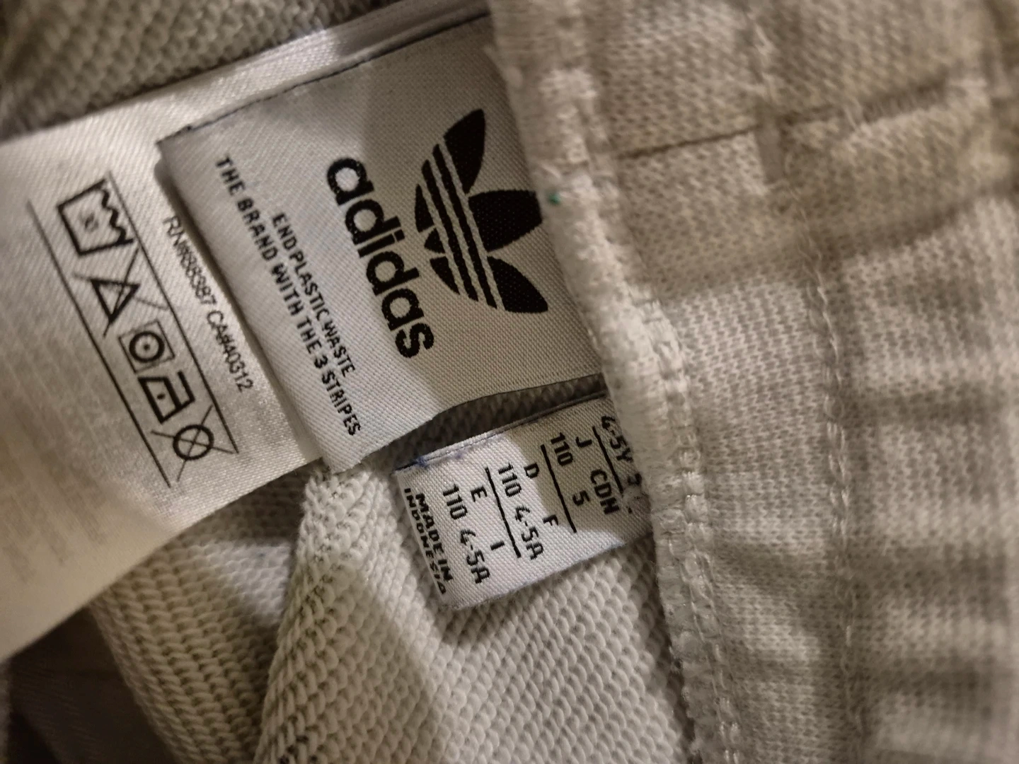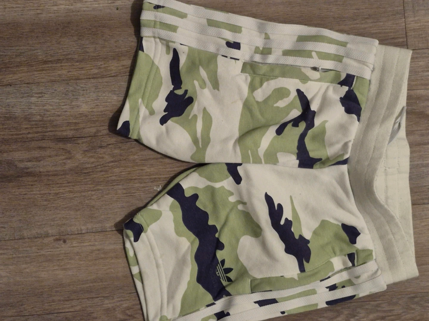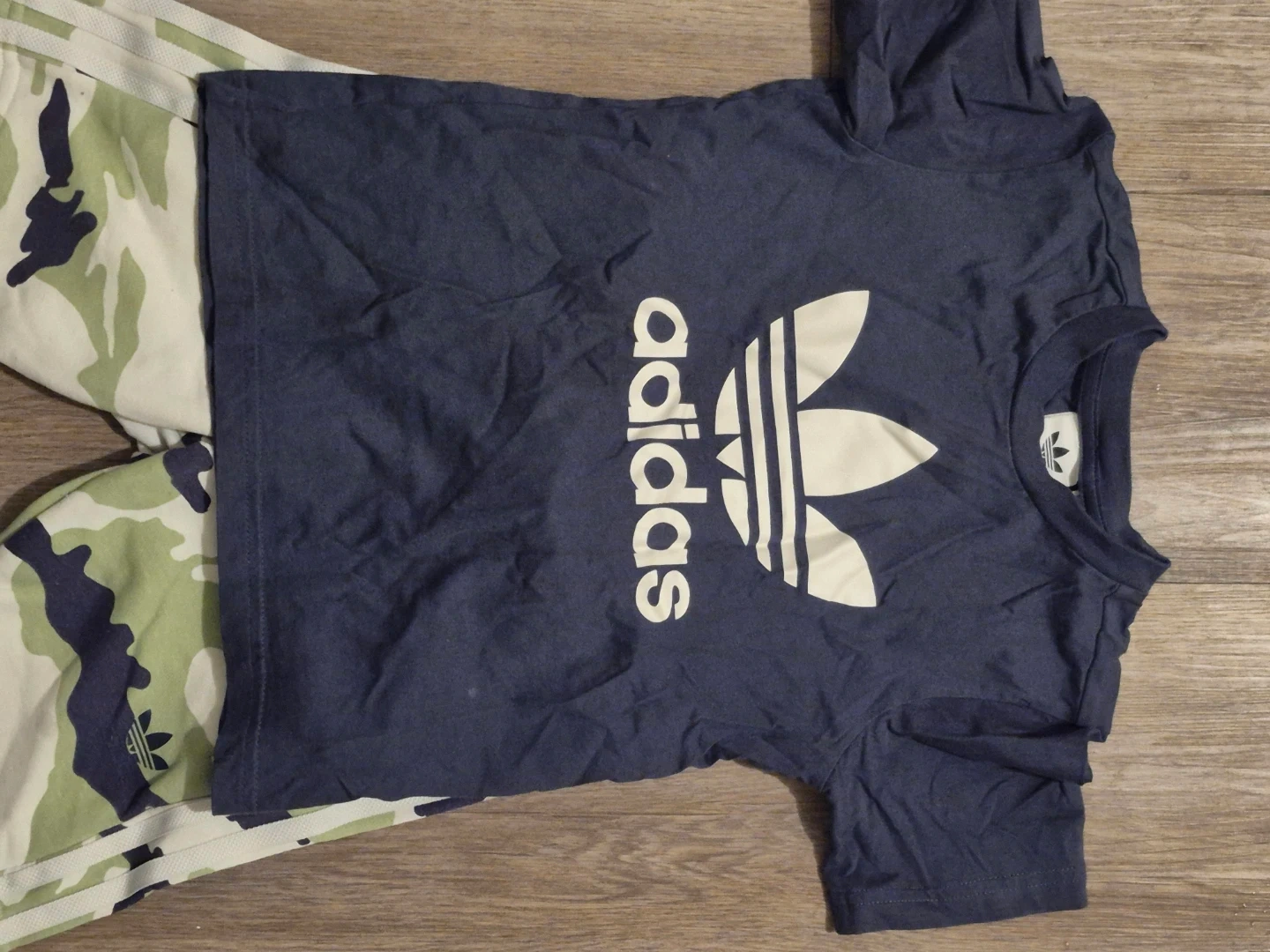 An Adidas kids' set featuring camouflage patterned shorts and a navy t-shirt with the iconic trefoil logo. Shorts are size 4-5Y / 110cm. T-shirt is also size 4-5Y / 110cm. Both are made of soft cotton blend.
