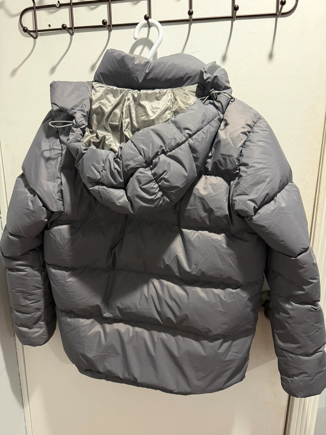 This is a grey The North Face Summit Series down puffer jacket. It's a size medium with a full zip front and attached hood. It's a warm and durable jacket.