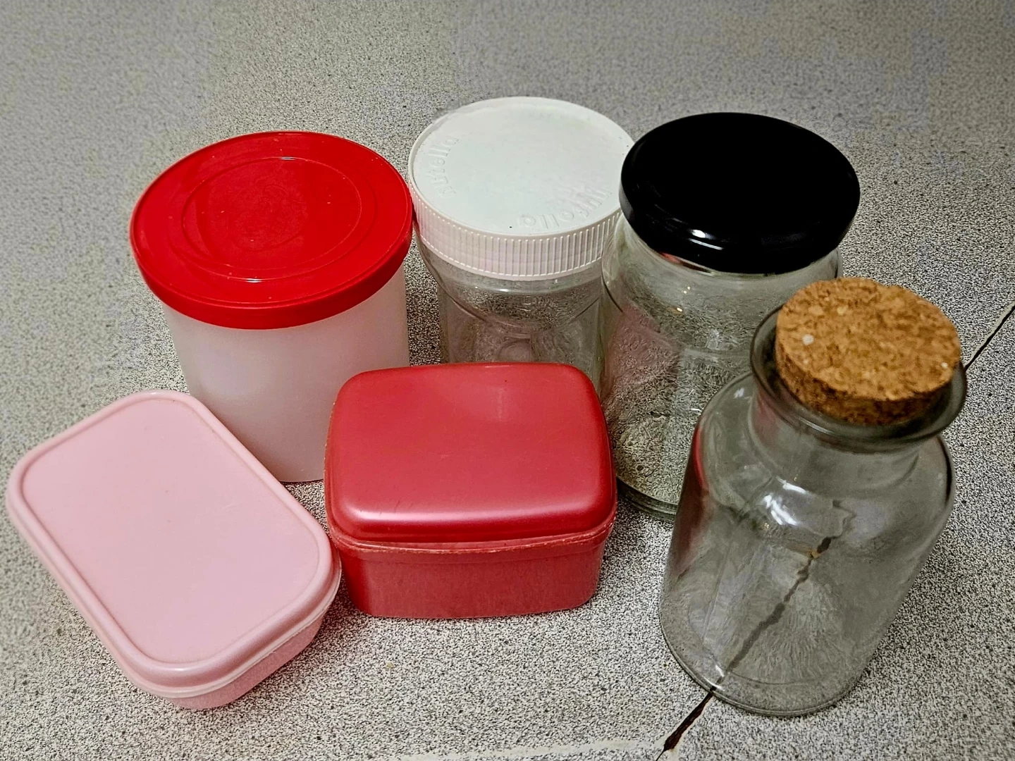 Bundle of assorted storage containers and glass jars with lids. Includes a pink lidded container, a red lidded container, a white-lidded jar, a black-lidded jar, and a cork-lidded glass bottle. Useful for organizing small items or craft supplies.