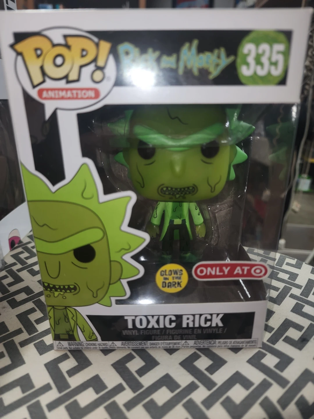 This is the Funko Pop! Animation Toxic Rick vinyl figure, number 335 from the Rick and Morty series. It glows in the dark. This figure is a collectible item.