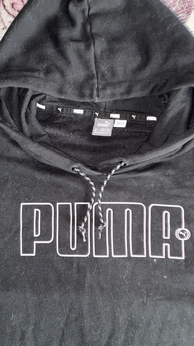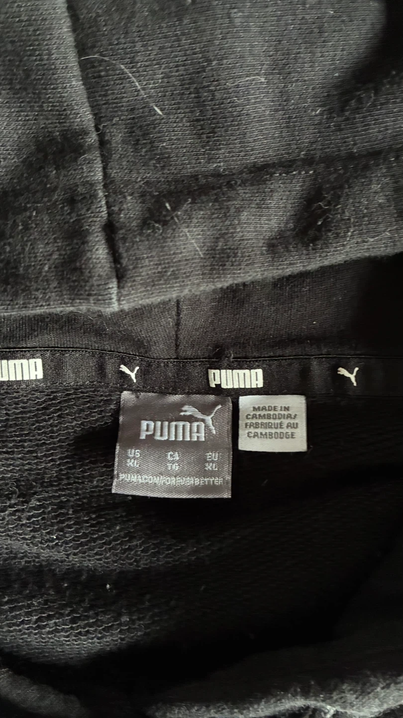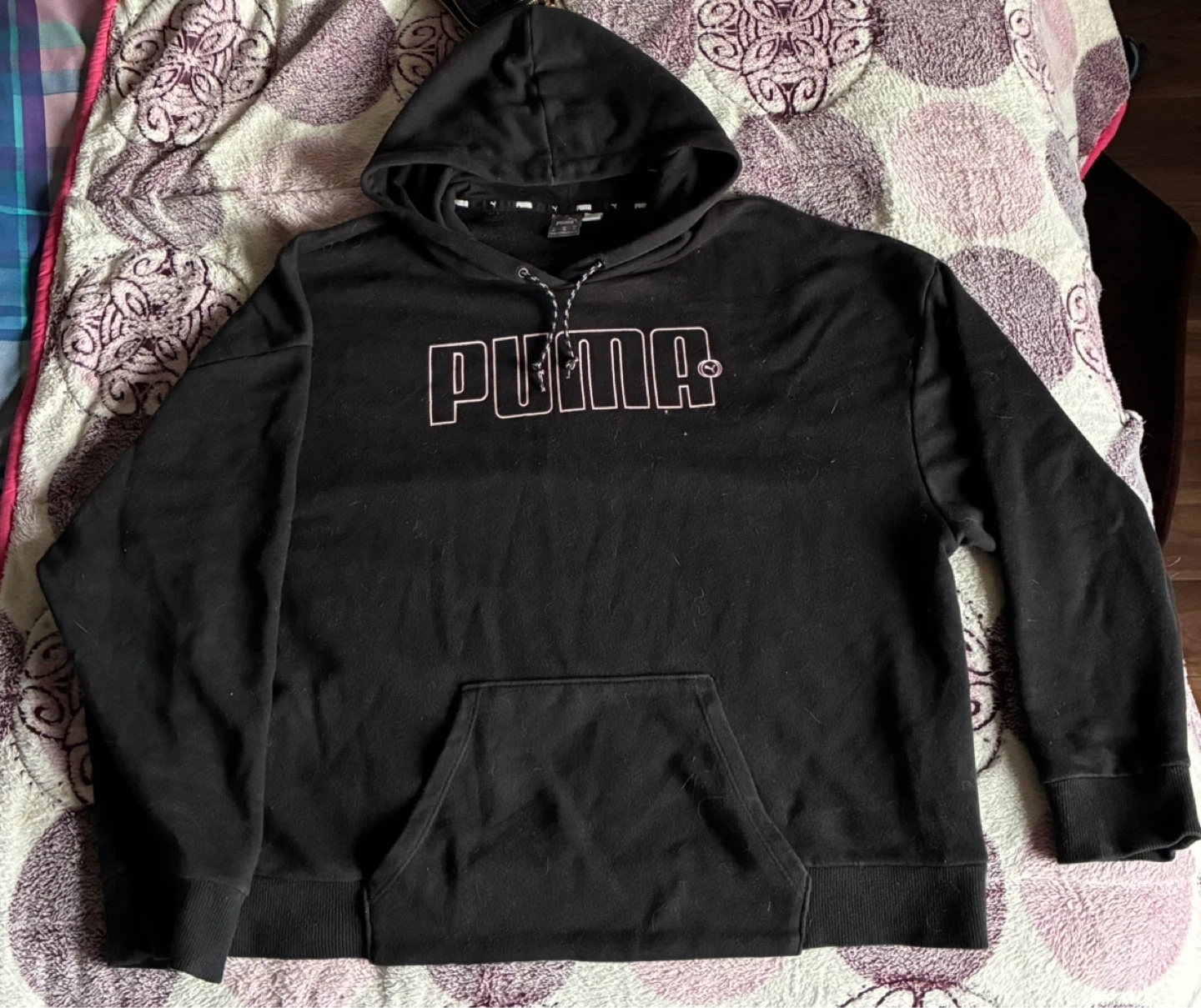 Black Puma hoodie with white and pink PUMA graphic on the front. Shell is 68% cotton and 32% polyester. Hood lining is 100% cotton. Ribbing is 98% cotton and 2% elastane. Size is XL. From Costco
